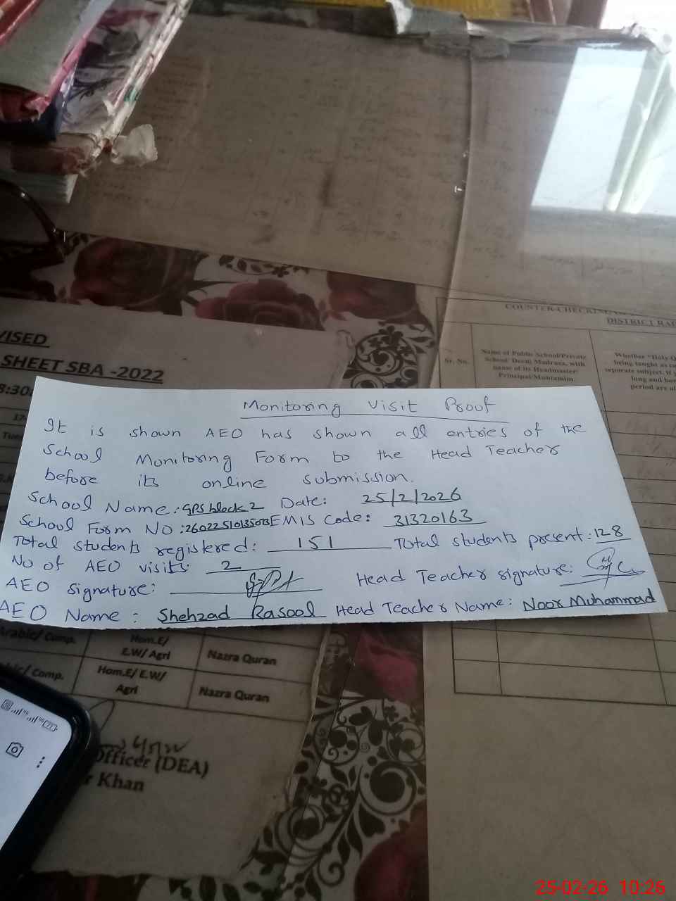 | Attendance Register | Head Teacher | MEA with School | Visit Proof |