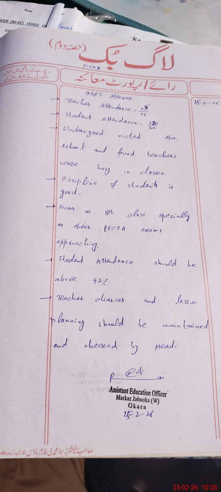 | Certified that this School was Inspected by the Undersigned MEA/DMO Today and the Information Stated Above is as Per Record. | |||||
