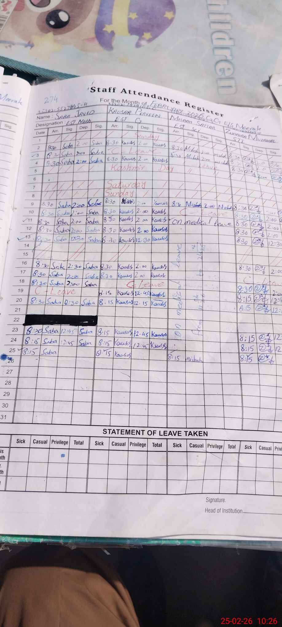 | Leave | Duty | Absent | Maternity | Medical | Ex- Pak |