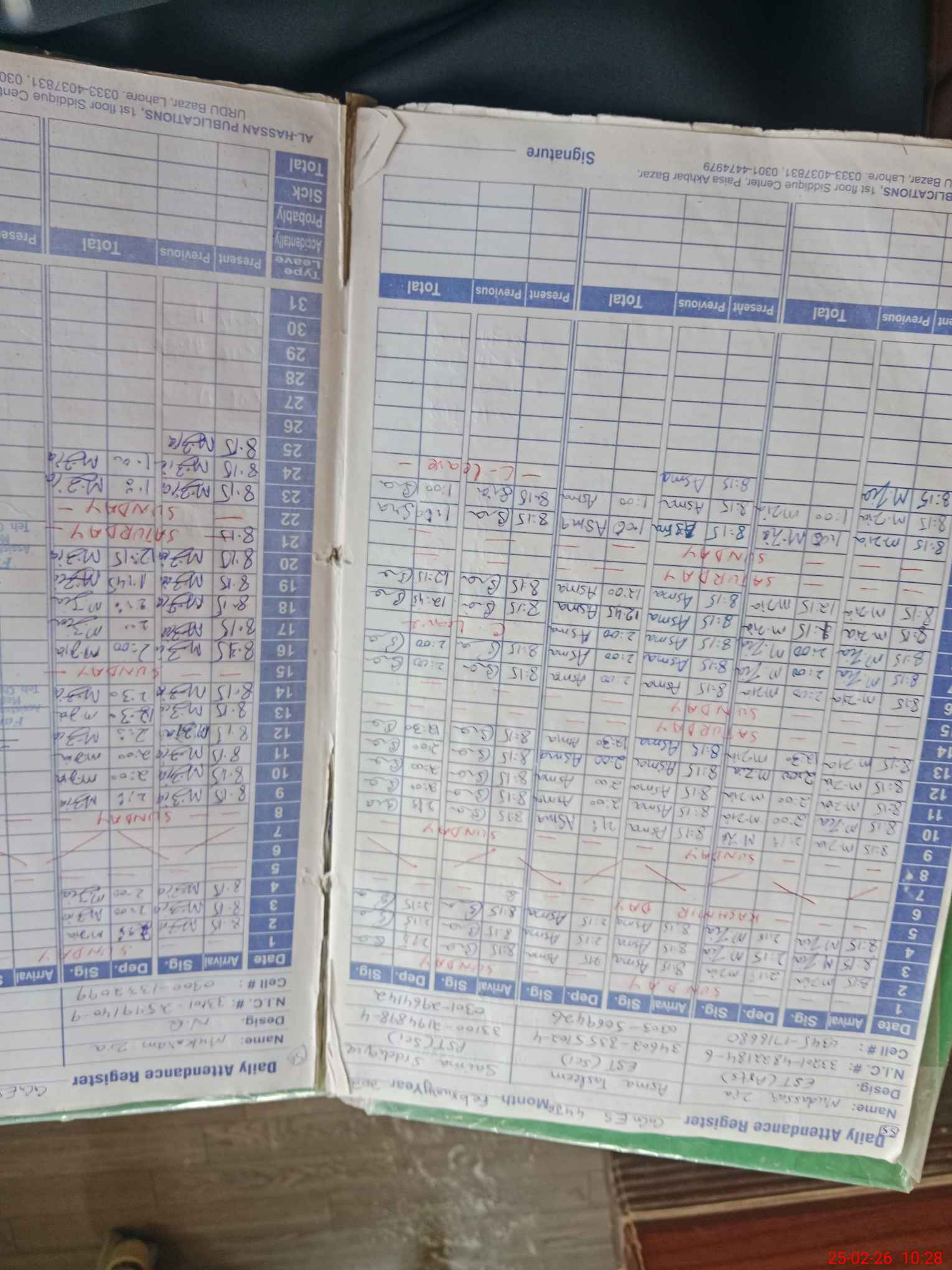 | CNIC | Full Name | Designation | R/C | Absence During Last Calender Month |