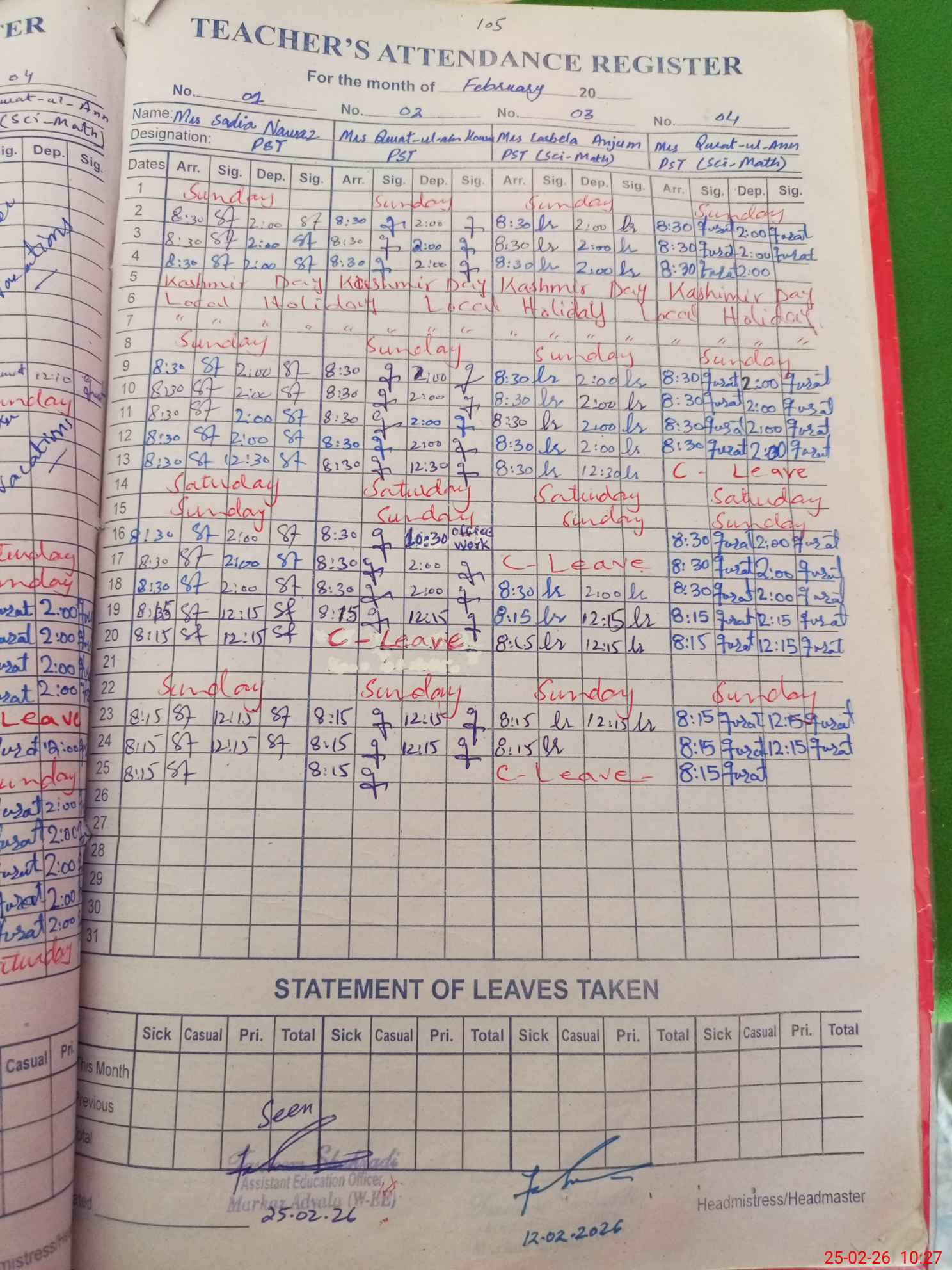 | Leave | Duty | Absent | Maternity | Medical | Ex- Pak |