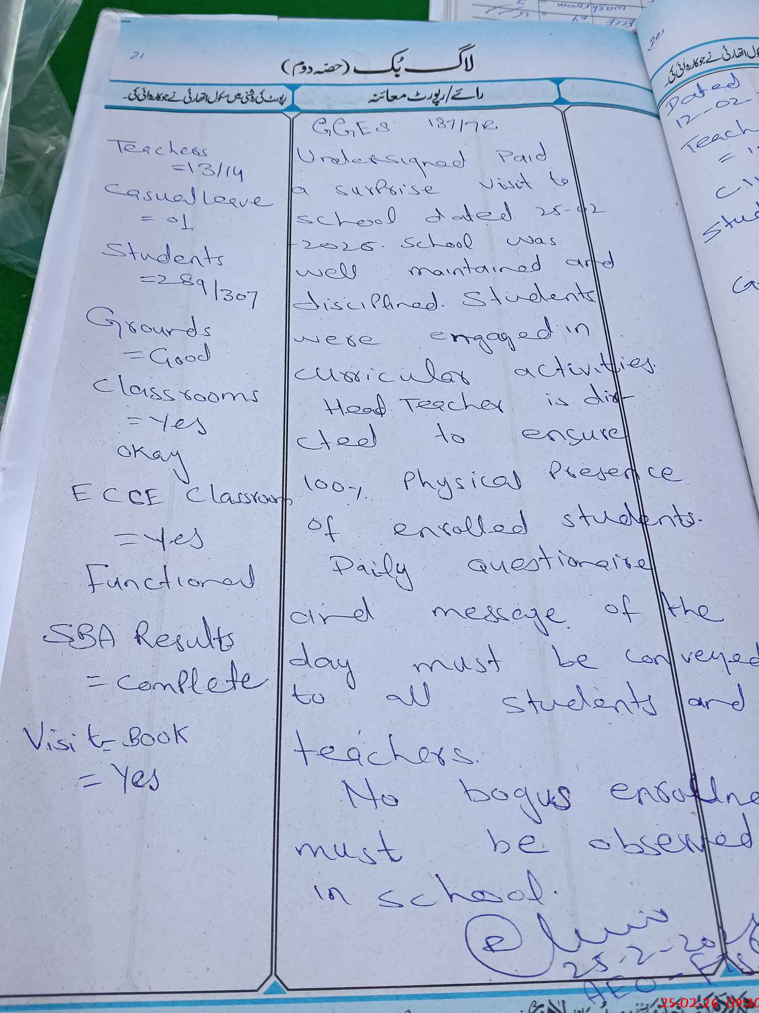 | Certified that this School was Inspected by the Undersigned MEA/DMO Today and the Information Stated Above is as Per Record. | |||||