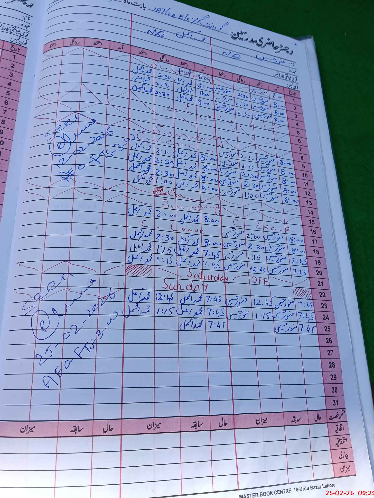 | CNIC | Full Name | Designation | R/C | Absence During Last Calender Month |
