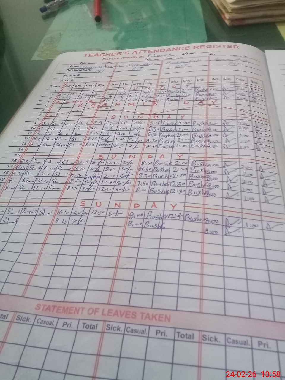| CNIC | Full Name | Designation | R/C | Absence During Last Calender Month |