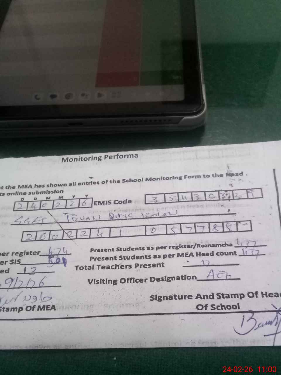 | Attendance Register | Head Teacher | MEA with School | Visit Proof |