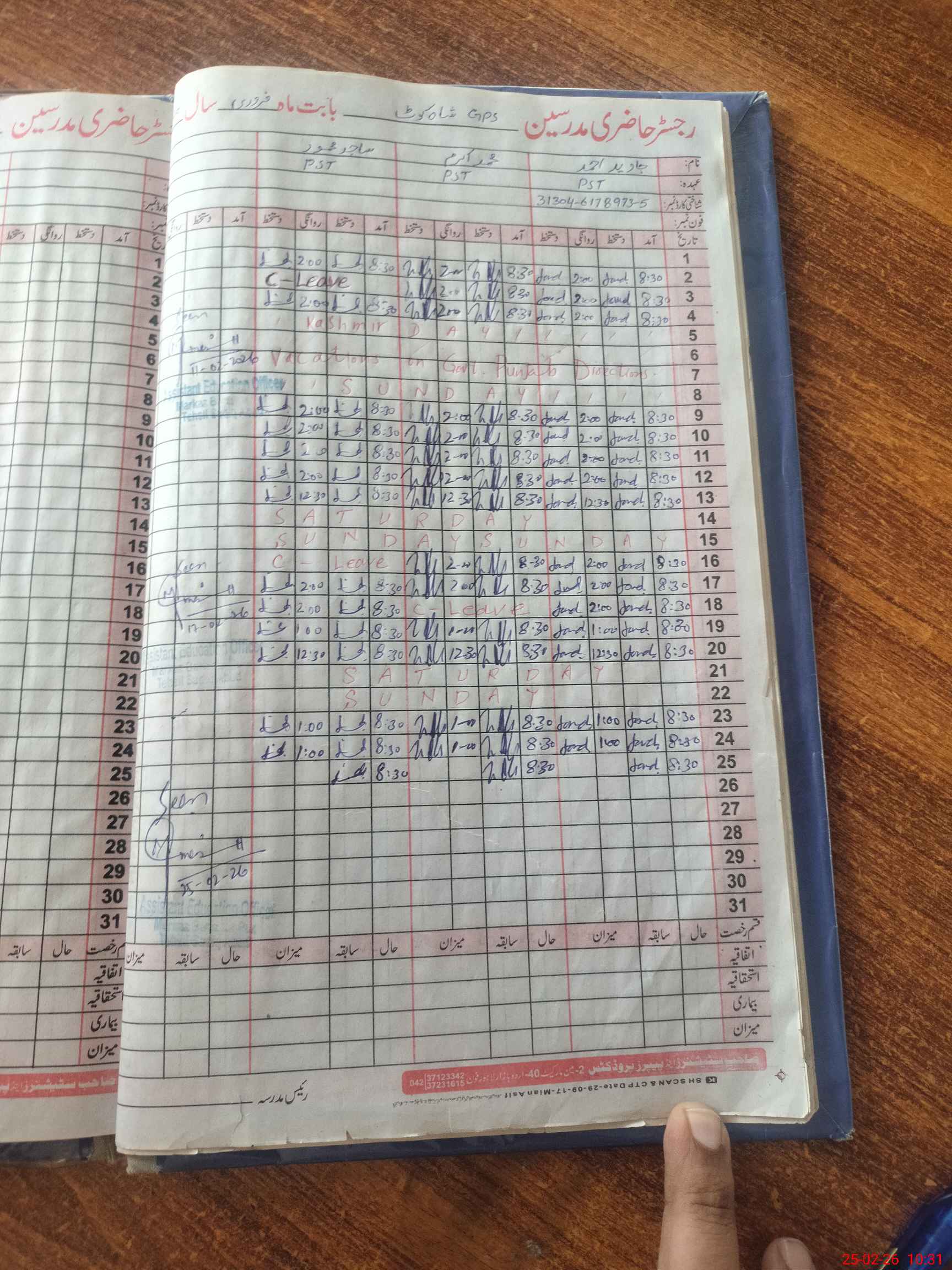 | CNIC | Full Name | Designation | R/C | Absence During Last Calender Month |