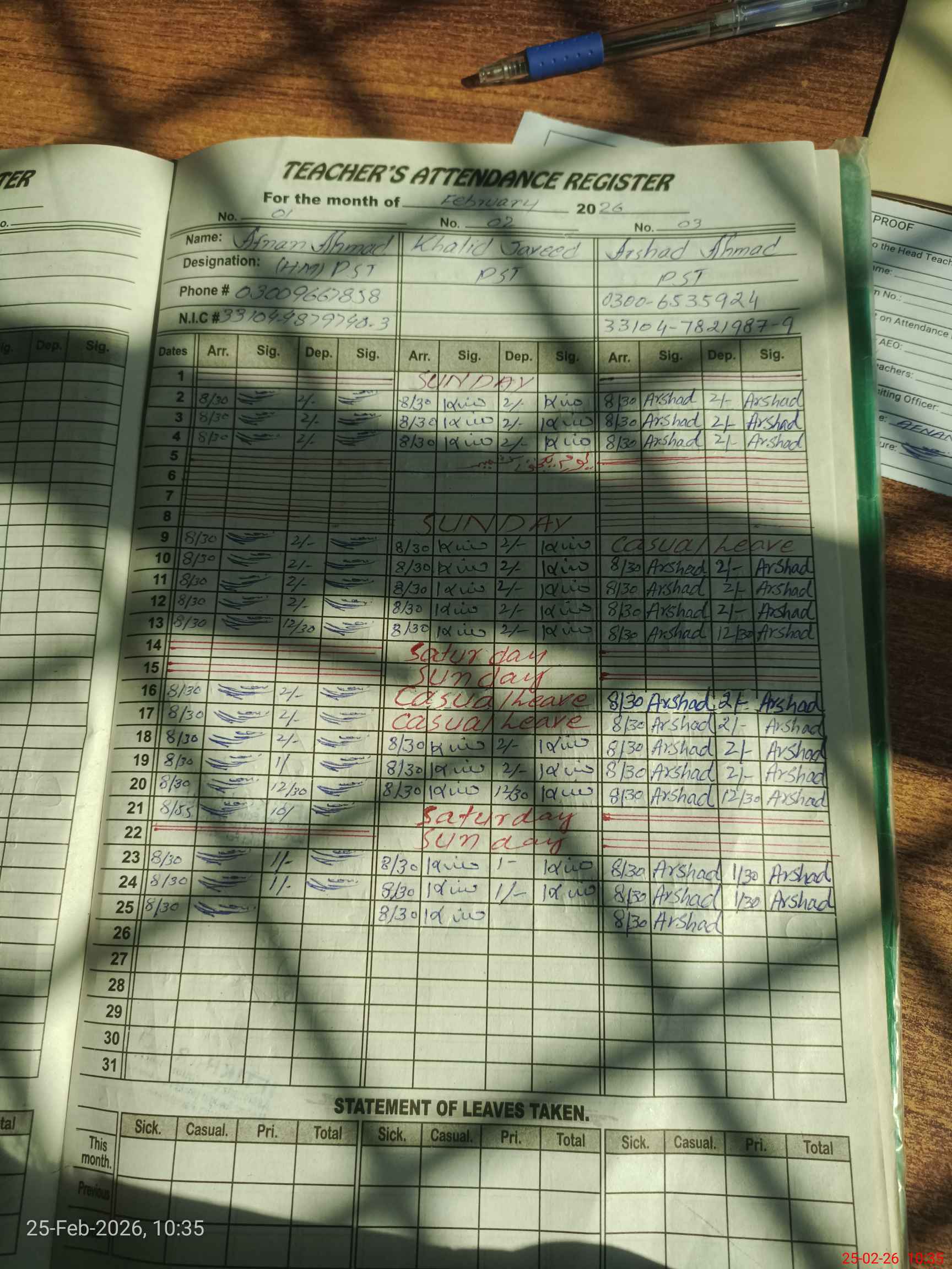 | Name: AF**** AH**** Designation: (School Headmaster's/Headmistress's) PST/PTC/JV Phone/Cell Number: 03**** |