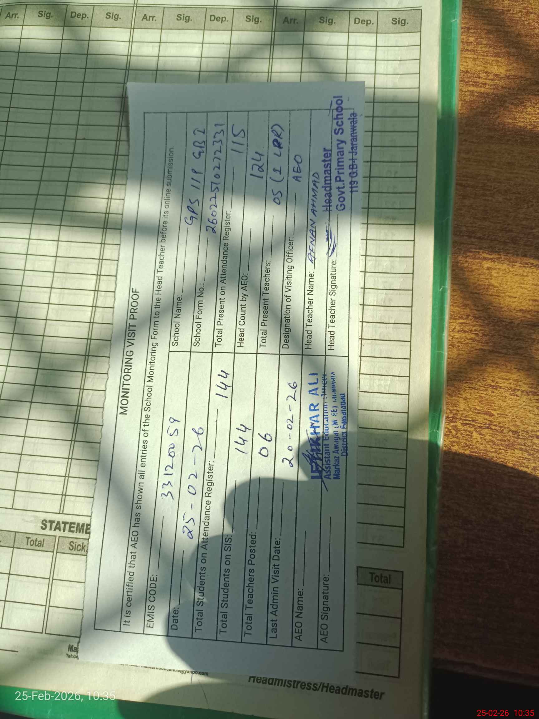 | EMIS Code: 33120059 | Name of School: GPS CHAK 119 GB JARANWALA | |||