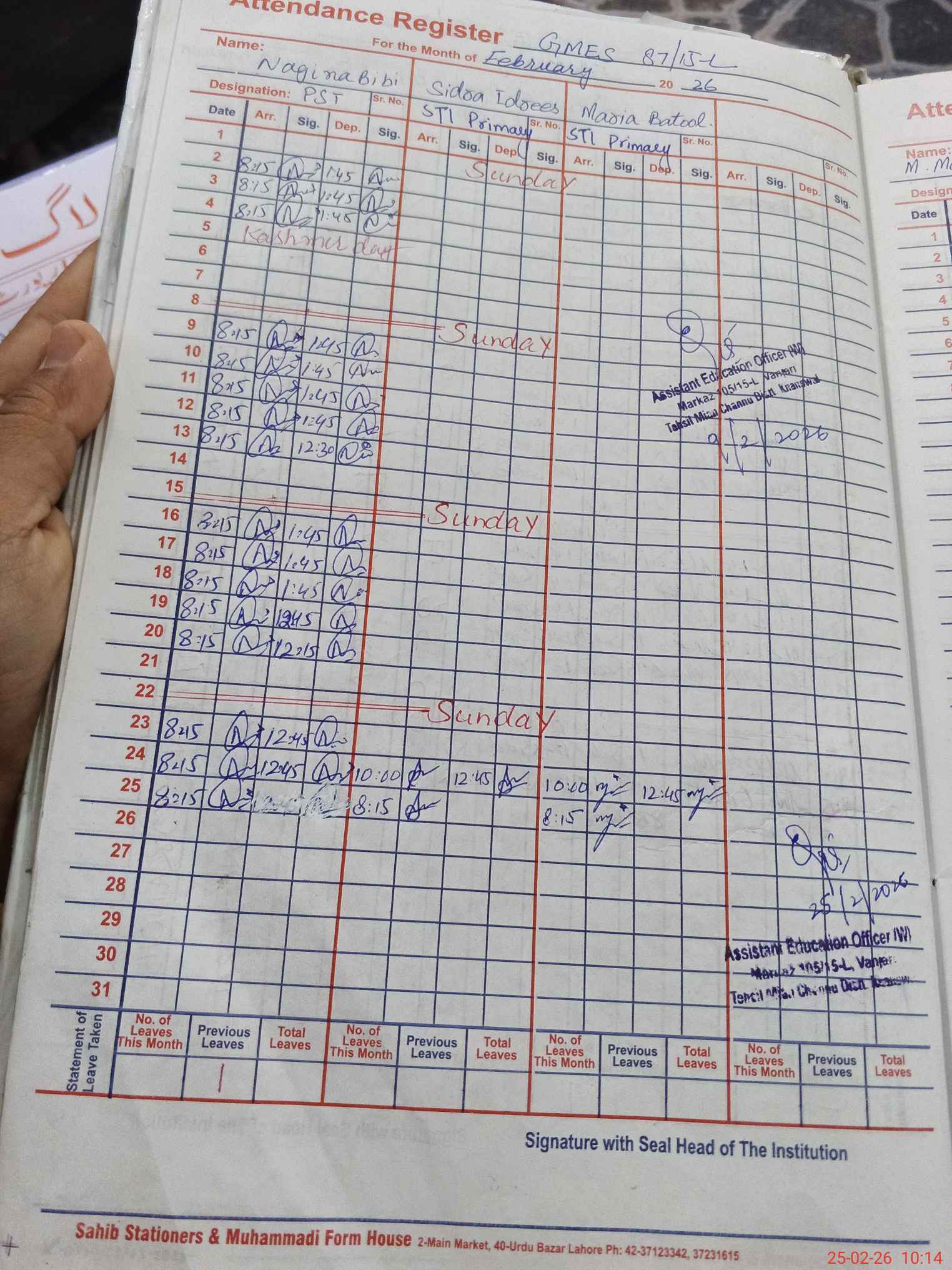 | Name: Mo**** Bi**** Designation: (School Headmaster's/Headmistress's) EST Phone/Cell Number: 03**** |