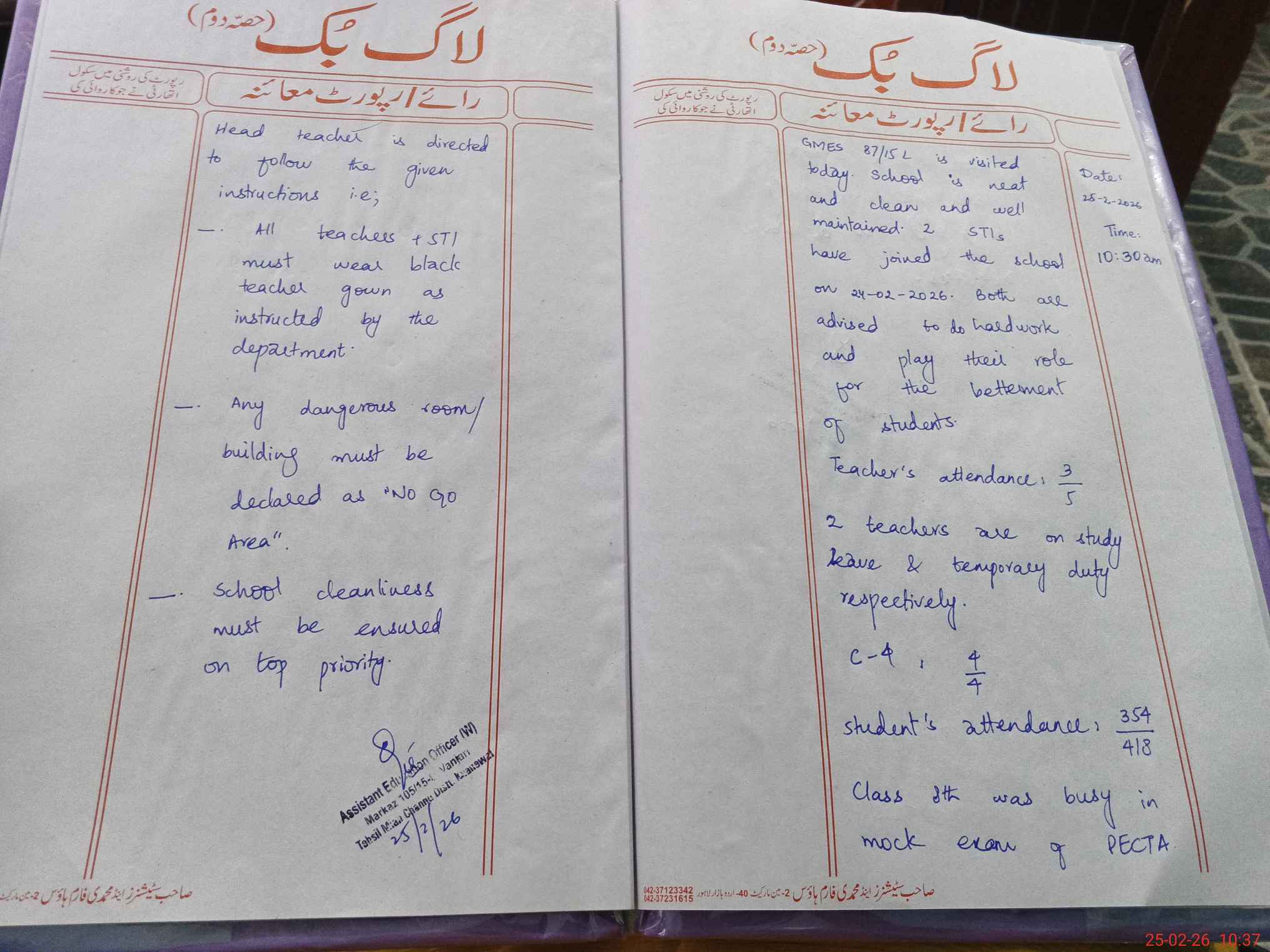 | Certified that this School was Inspected by the Undersigned MEA/DMO Today and the Information Stated Above is as Per Record. | |||||