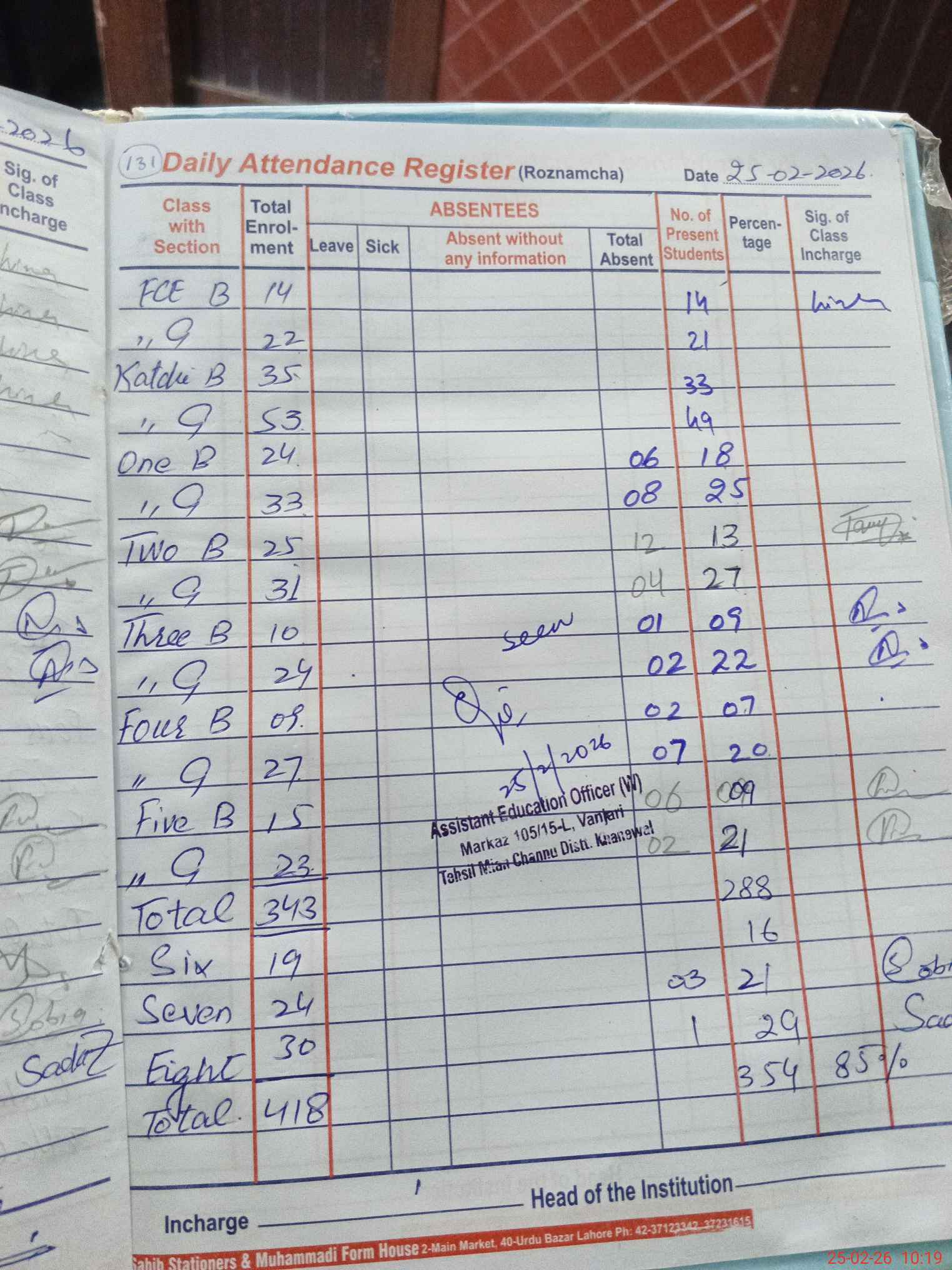 | Total Students Present | 0 | 35 | 43 | 40 | 31 | 27 | 30 | 16 | 21 | 29 | 354 | |||||