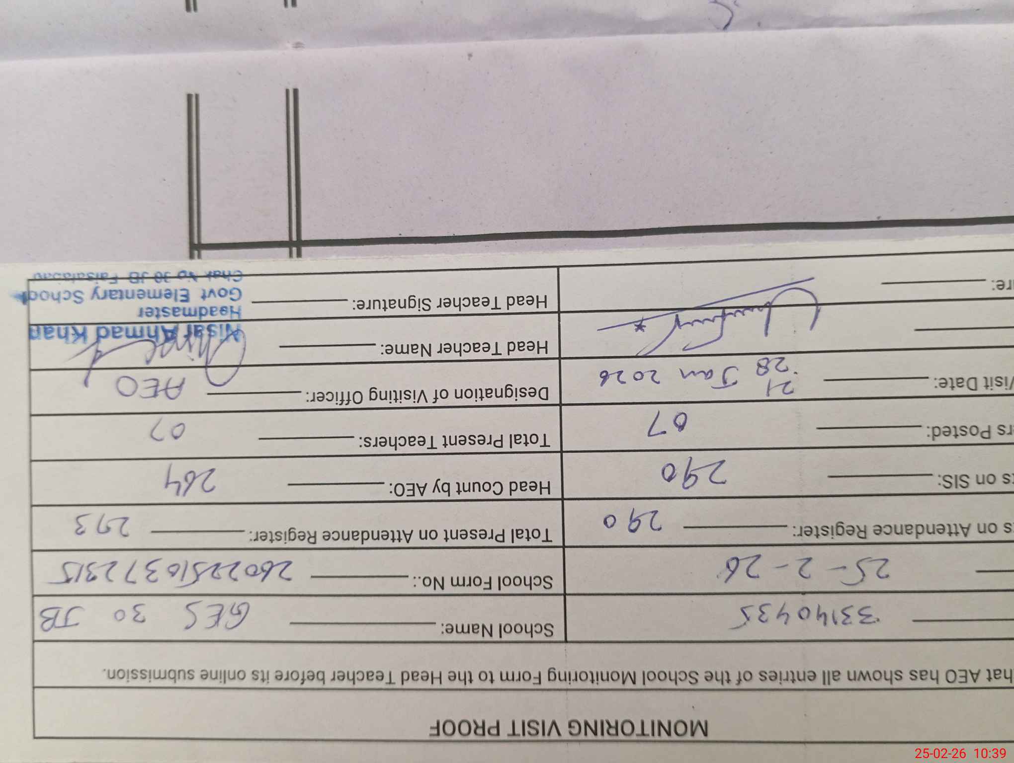 | Attendance Register | Head Teacher | MEA with School | Visit Proof |