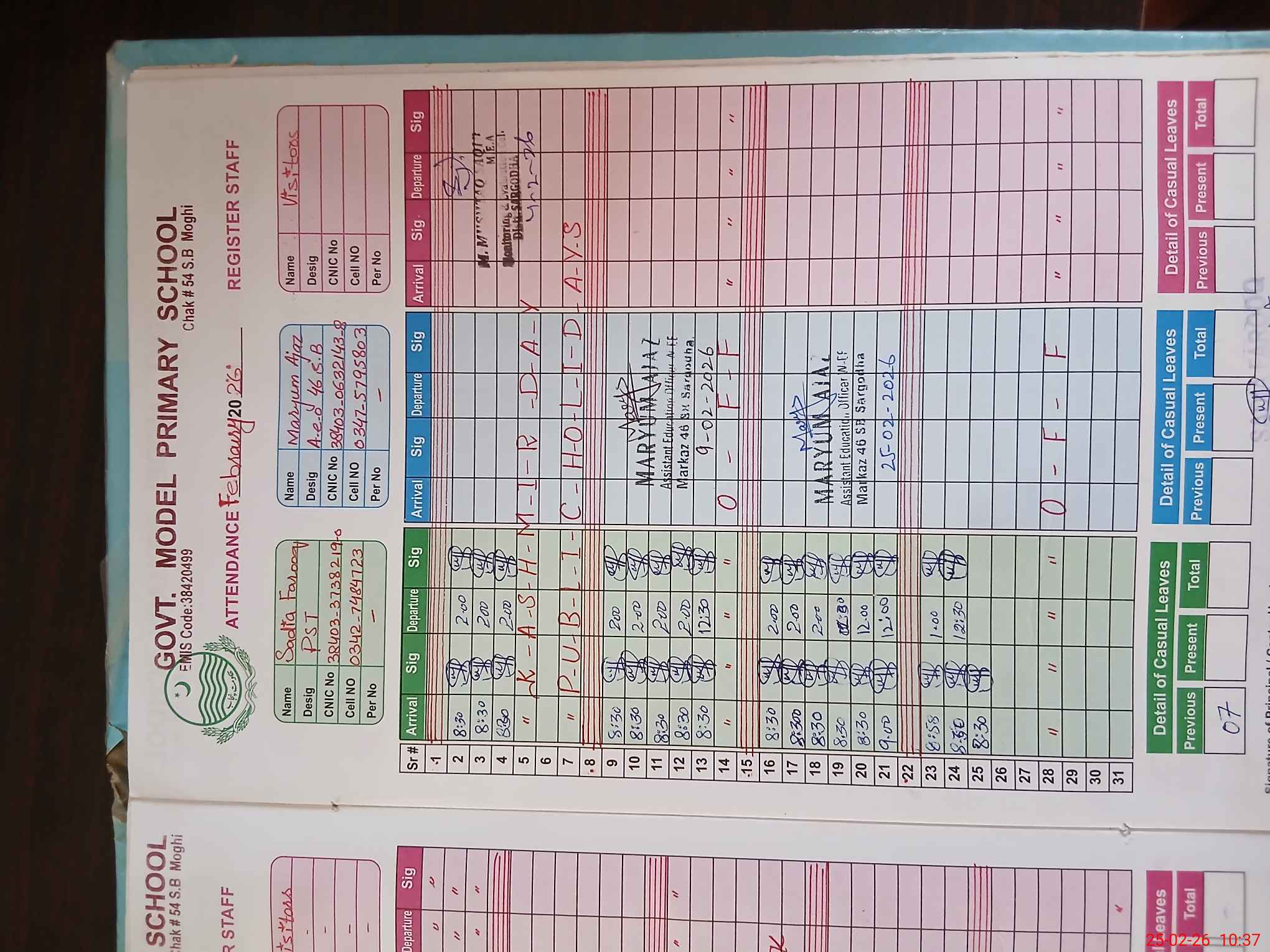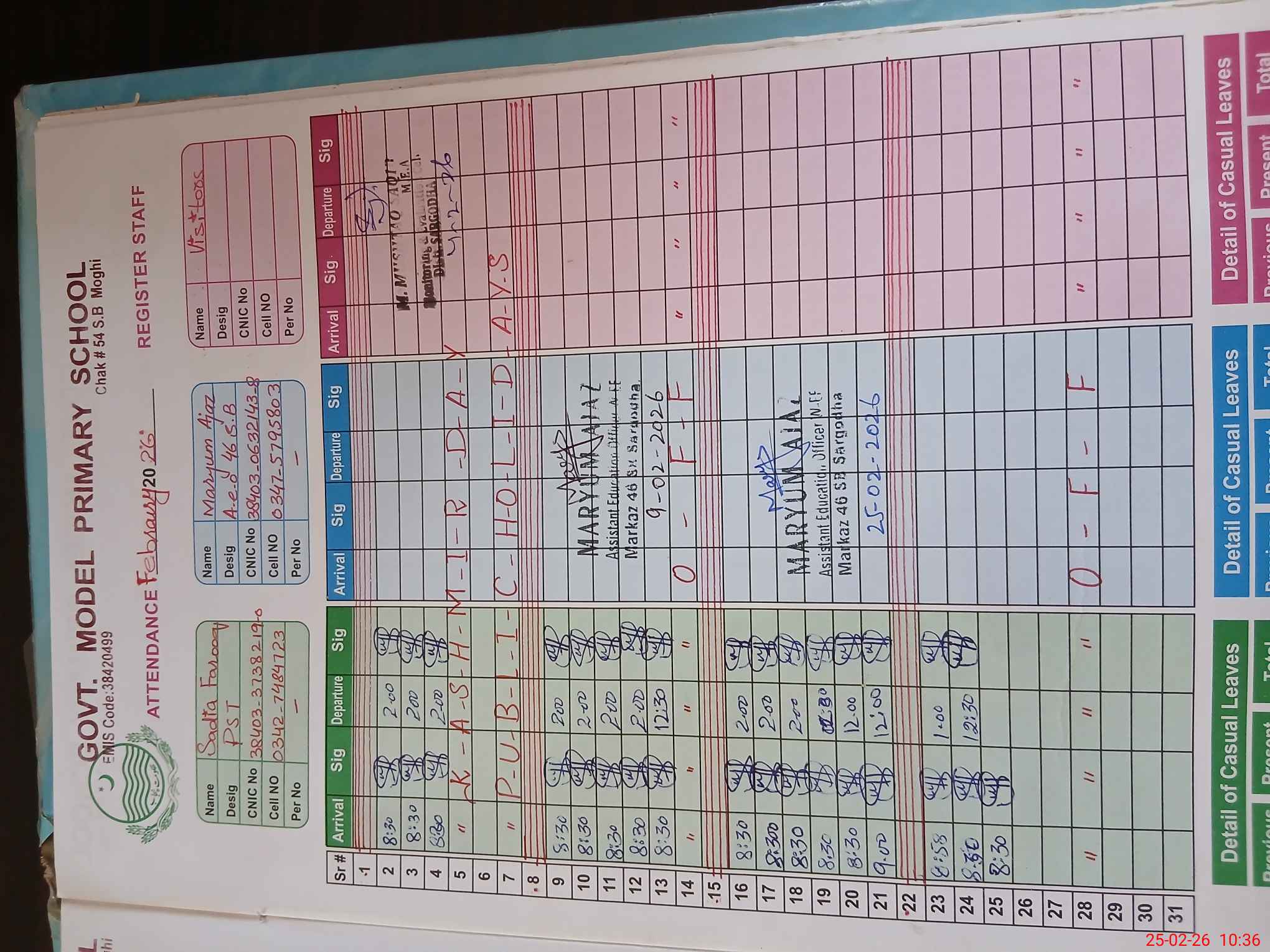 | Name: SA**** FA**** Designation: (School Headmaster's/Headmistress's) PST (SCI-MATH) Phone/Cell Number: 03**** |