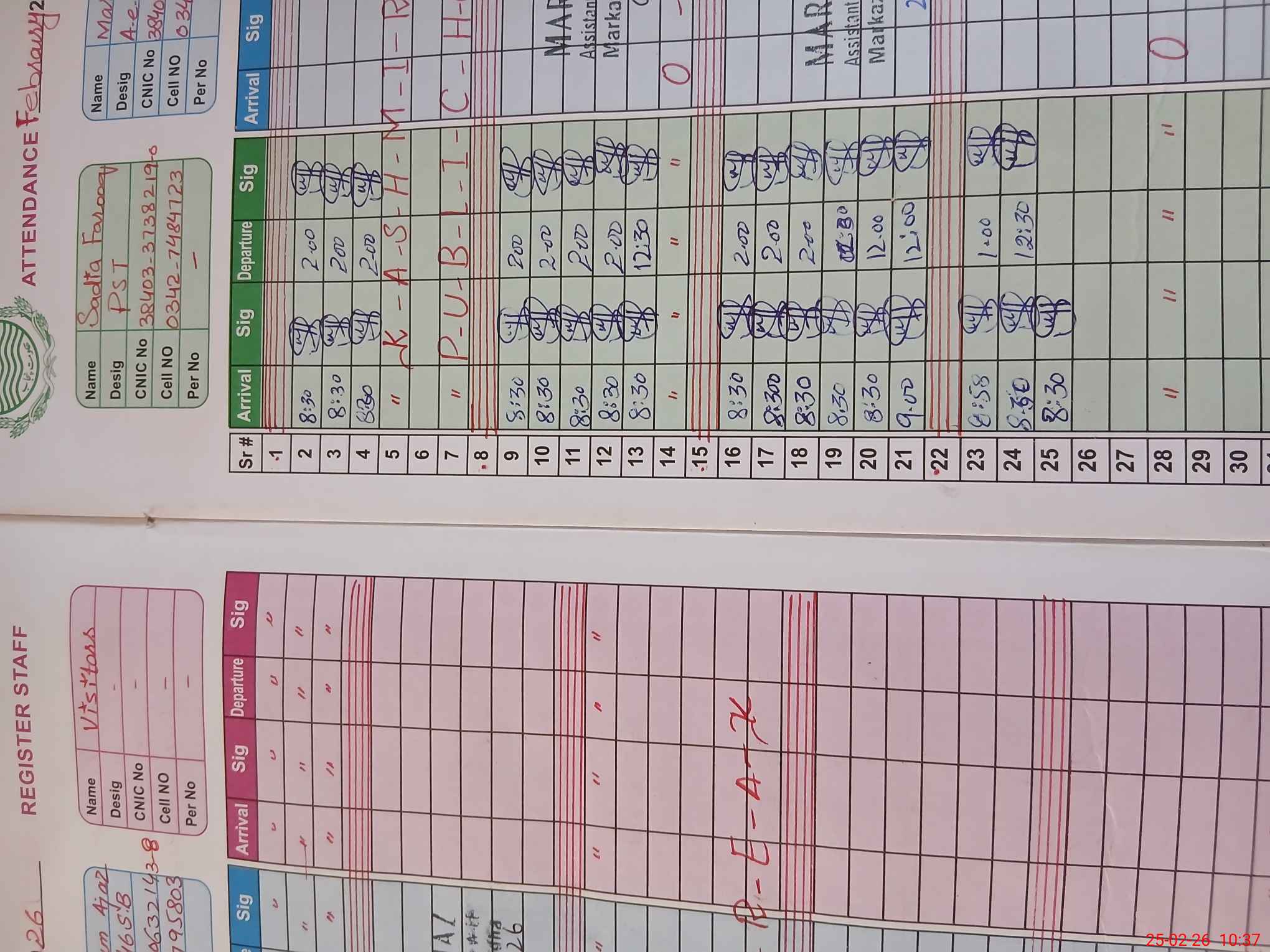 | CNIC | Full Name | Designation | R/C | Absence during last cal. month |