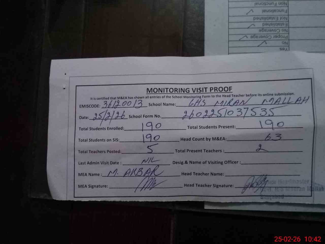 | Attendance Register | Head Teacher | MEA with School | Visit Proof |
