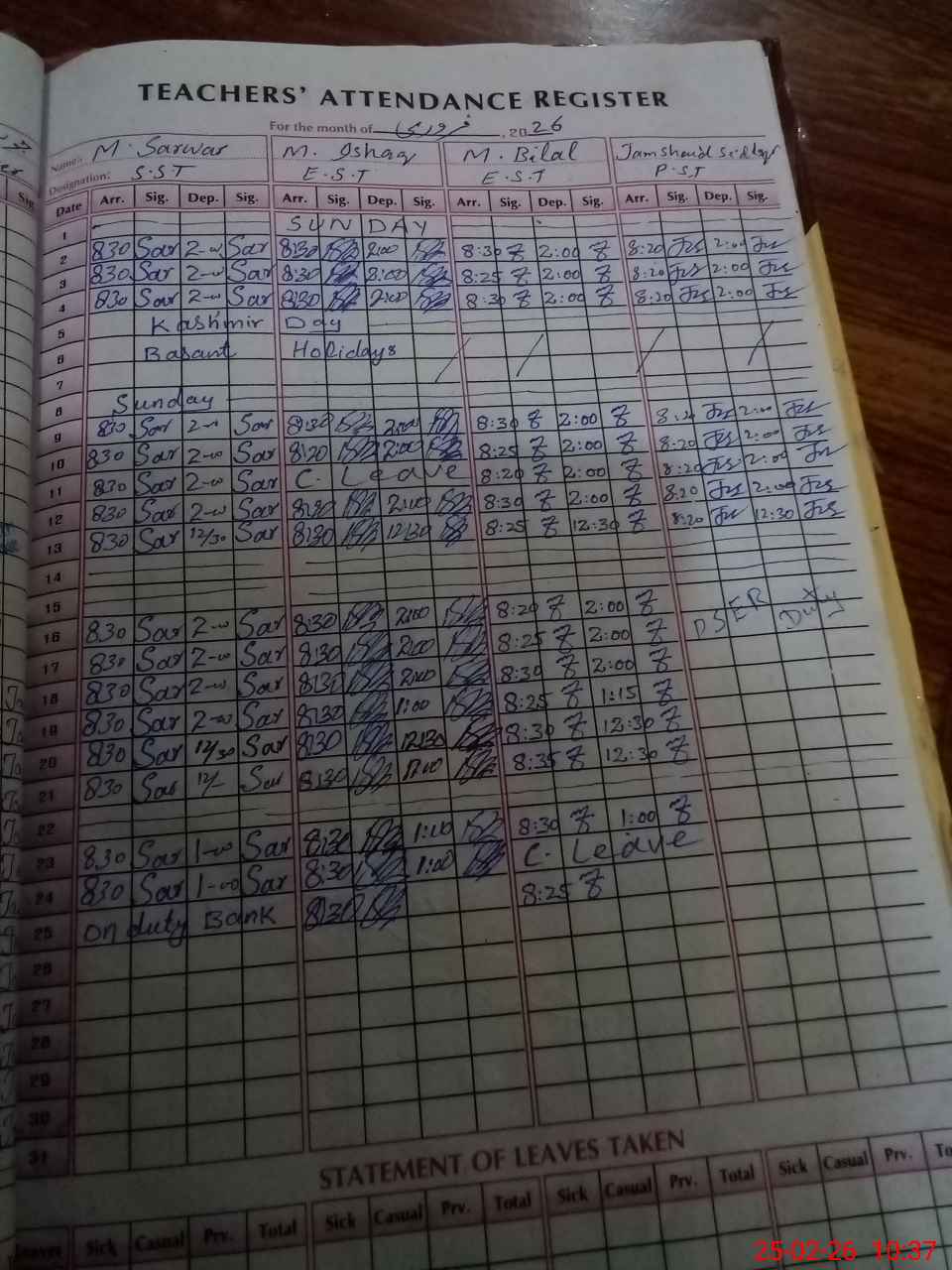 | Leave | Duty | Absent | Maternity | Medical | Ex- Pak |
