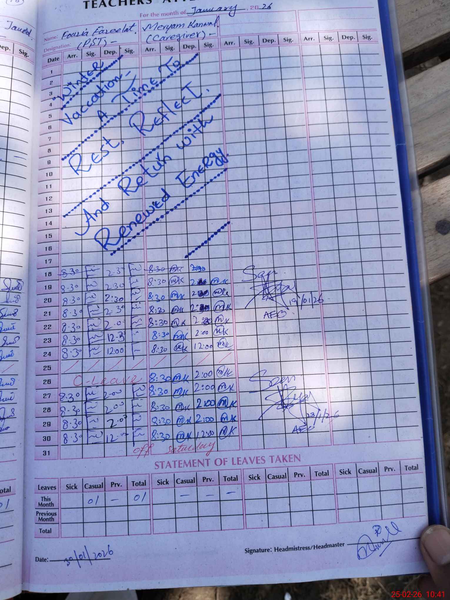 | Attendance Register | Head Teacher | MEA with School | Visit Proof |
