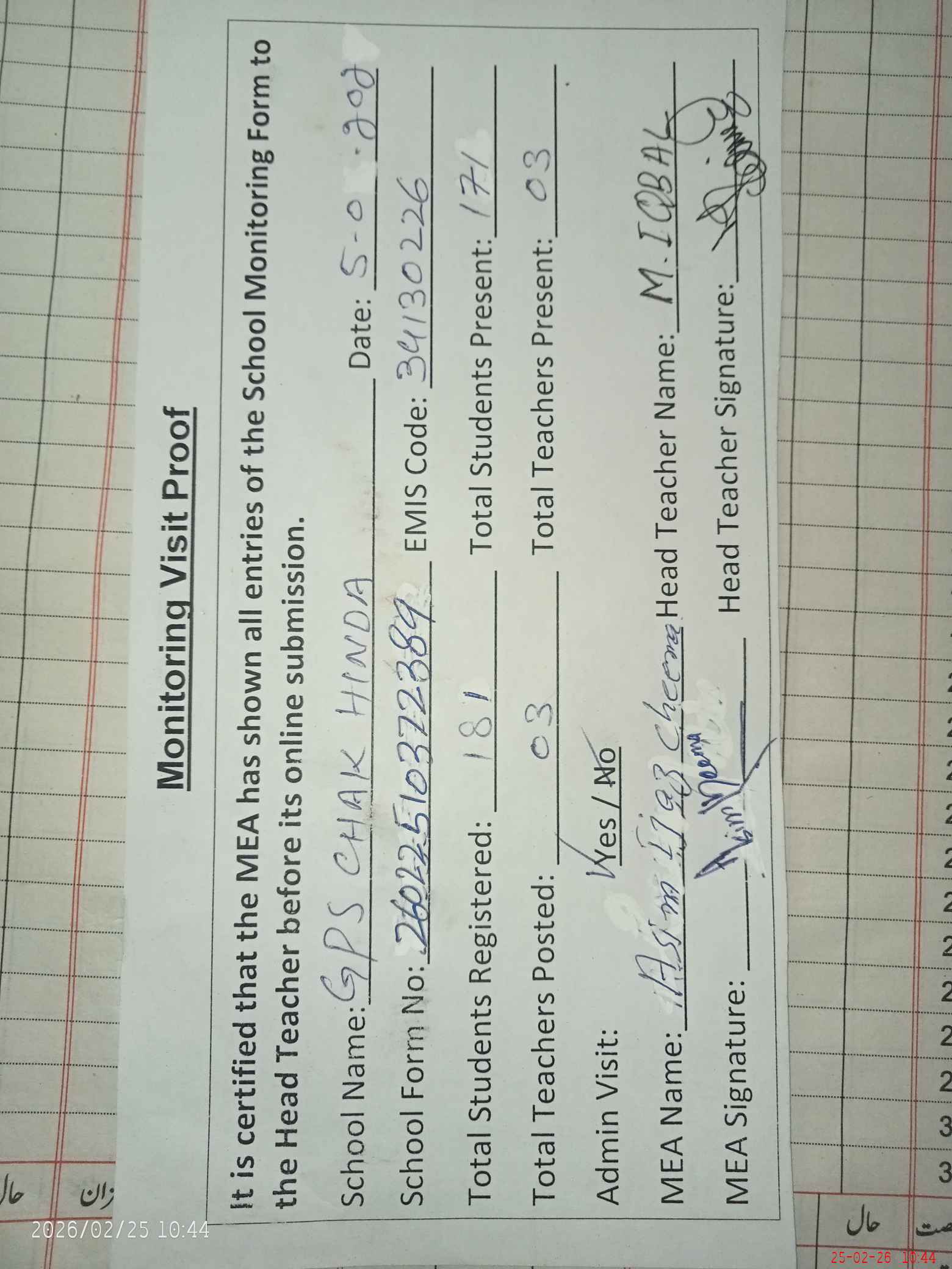 | Attendance Register | Head Teacher | MEA with School | Visit Proof |