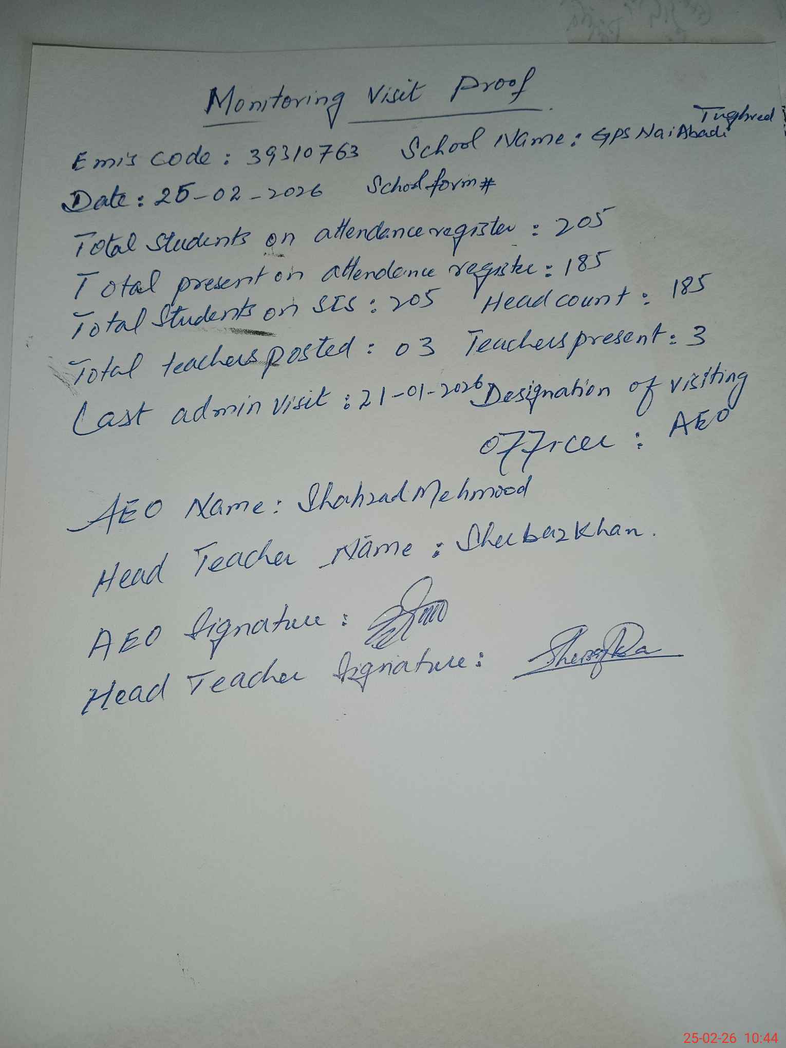 | EMIS Code: 39310763 | Name of School: GPS NAI ABADI TUGHRAIL | |||
