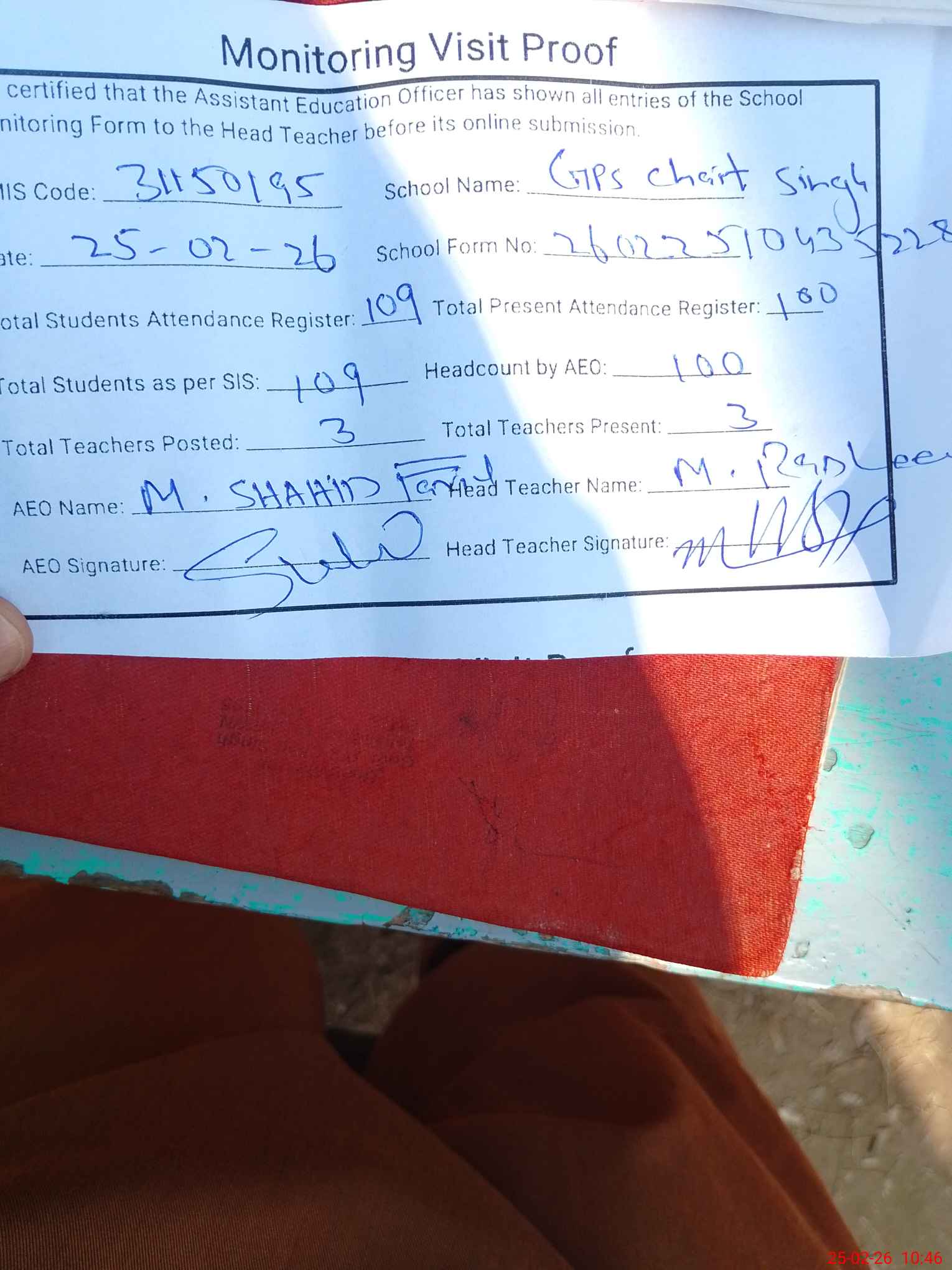 | Attendance Register | Head Teacher | MEA with School | Visit Proof |