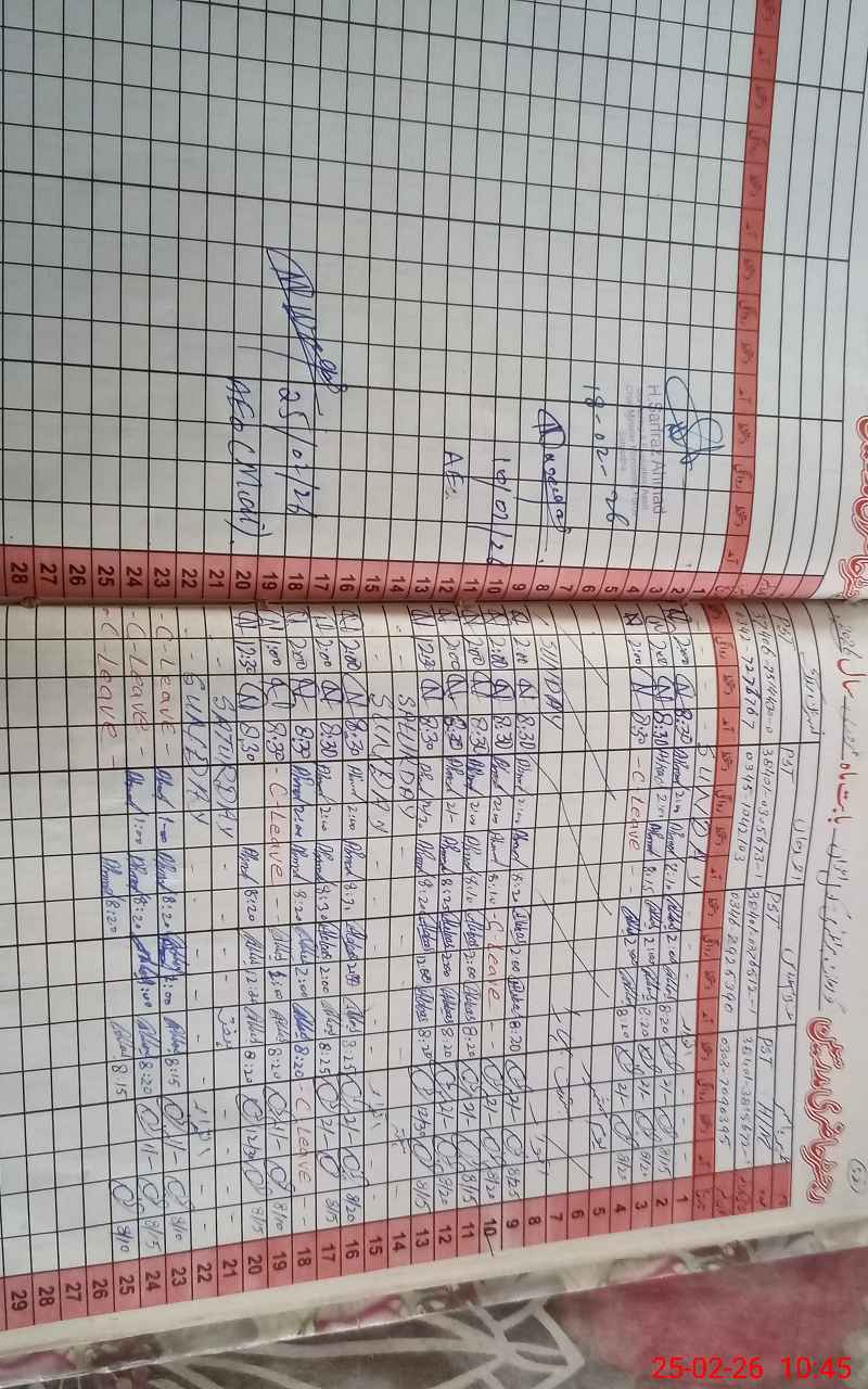 | CNIC | Full Name | Designation | R/C | Absence During Last Calender Month |