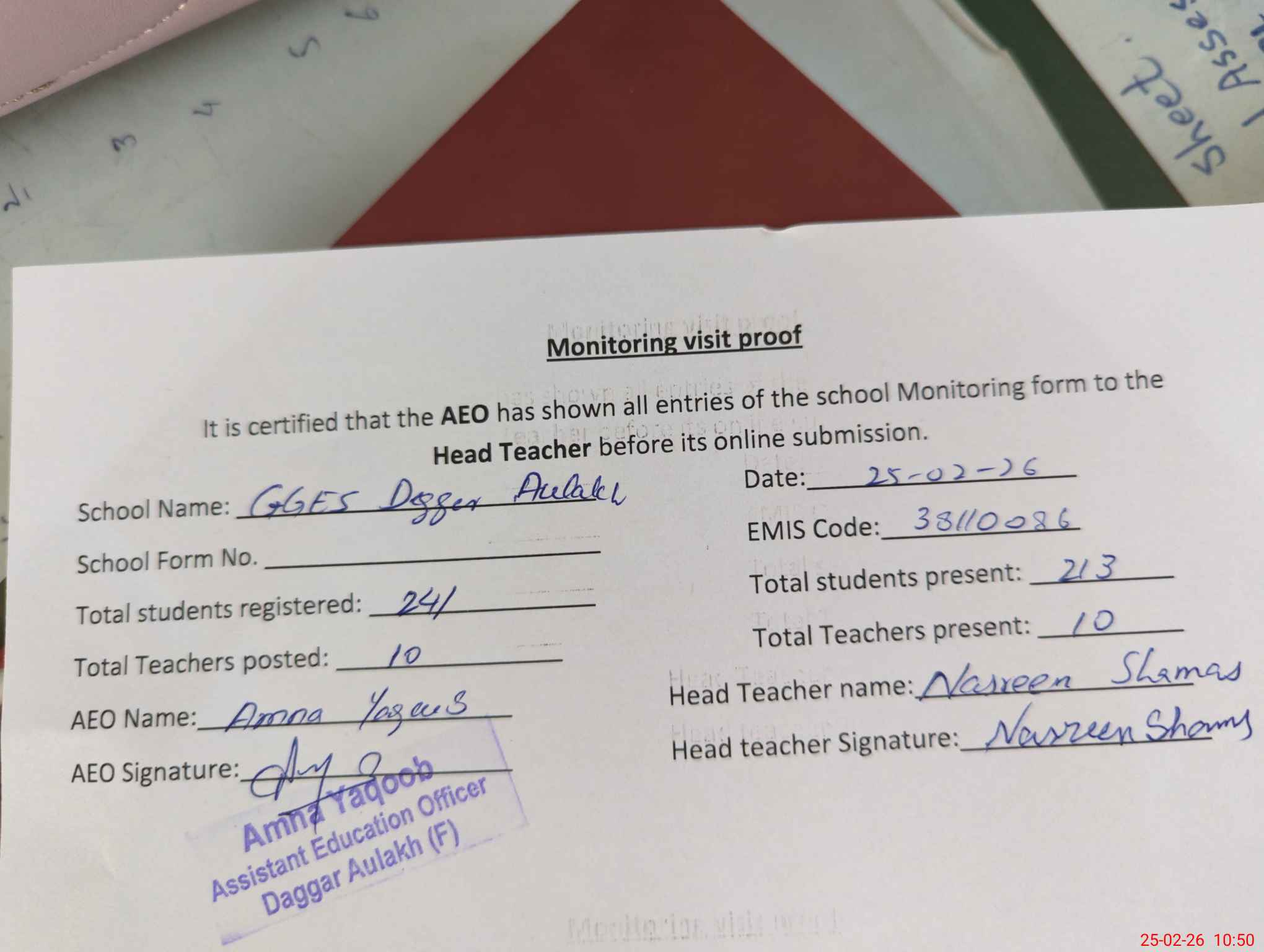 | Attendance Register | Head Teacher | MEA with School | Visit Proof |
