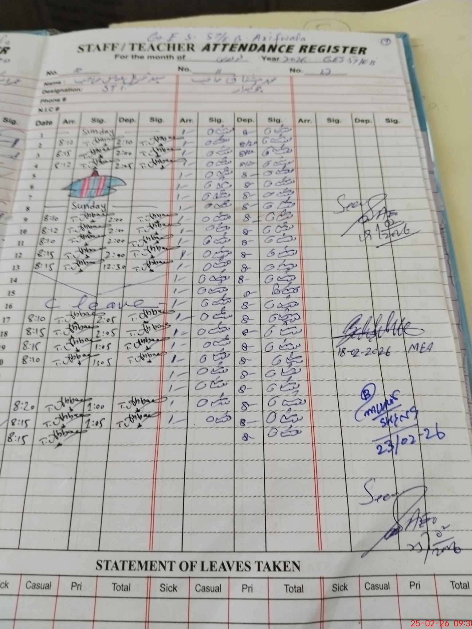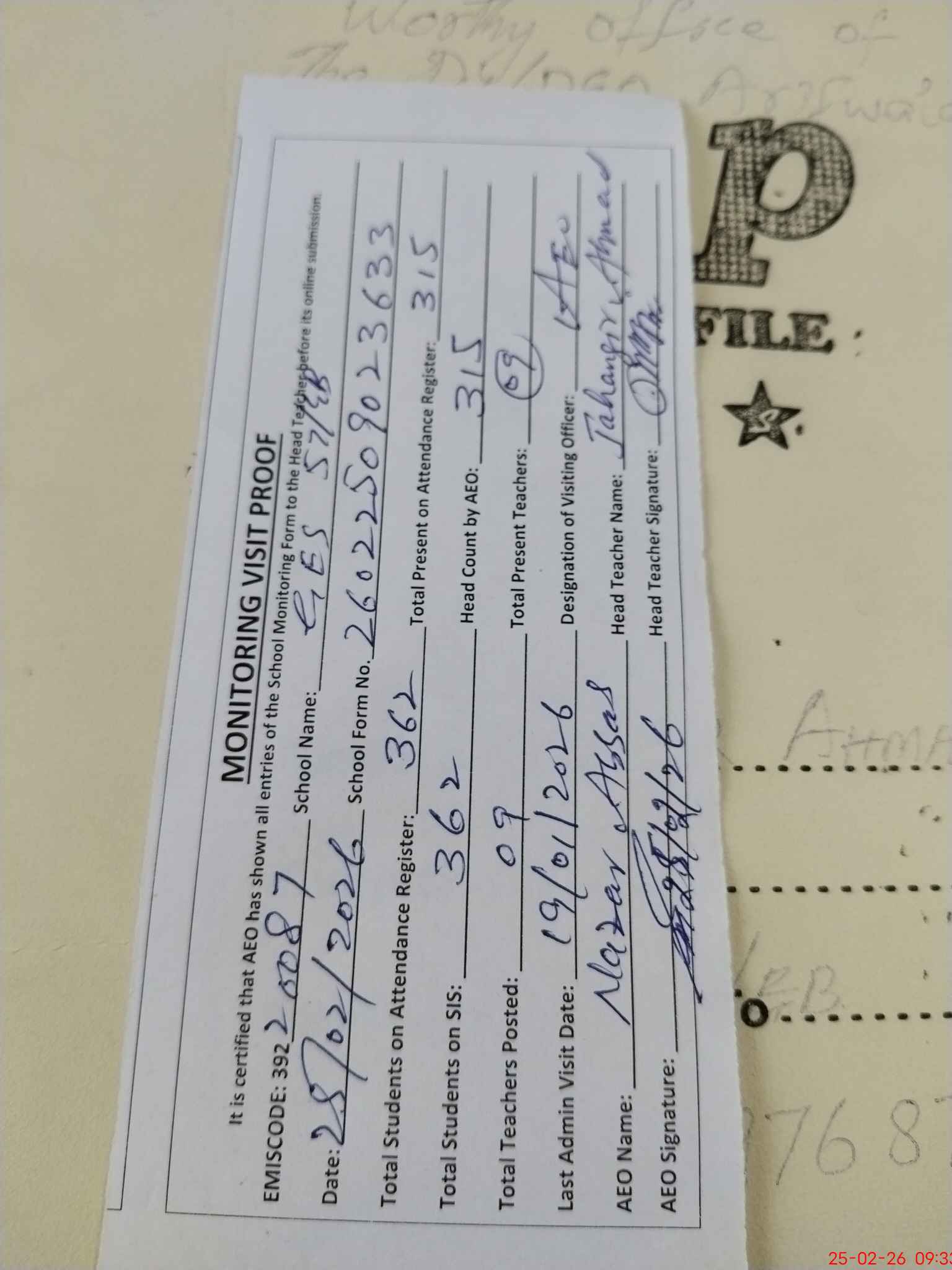 | Attendance Register | Head Teacher | MEA with School | Visit Proof |