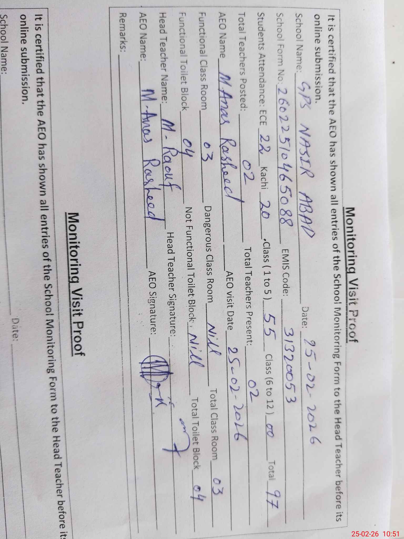 | Certified that this School was Inspected by the Undersigned MEA/DMO Today and the Information Stated Above is as Per Record. | |||||