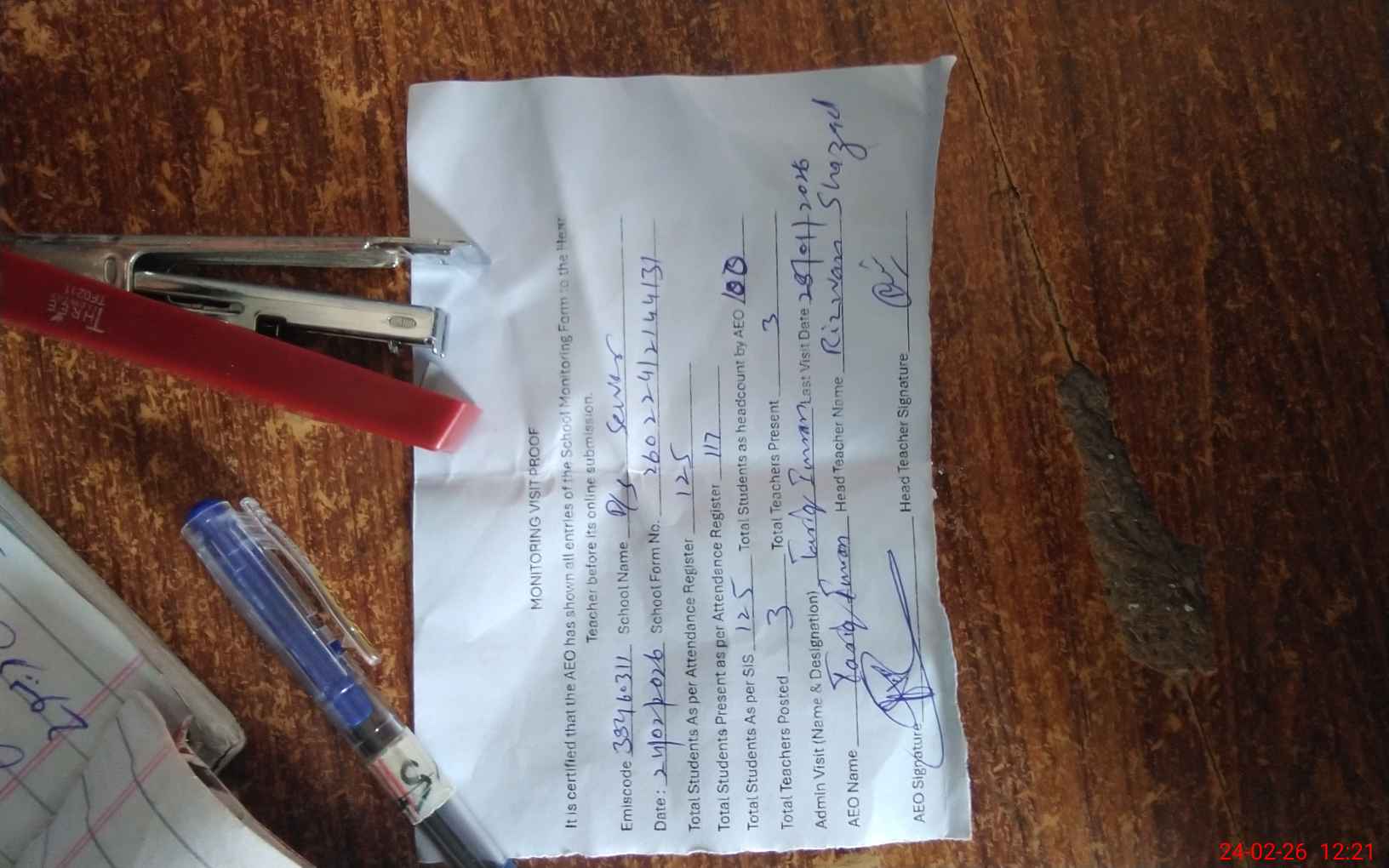 | Attendance Register | Head Teacher | MEA with School | Visit Proof |