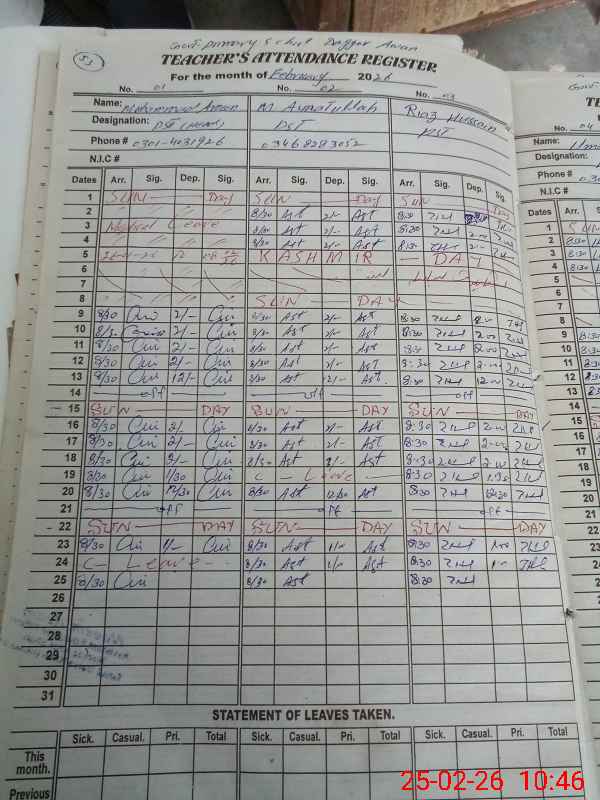 | CNIC | Full Name | Designation | R/C | Absence During Last Calender Month |