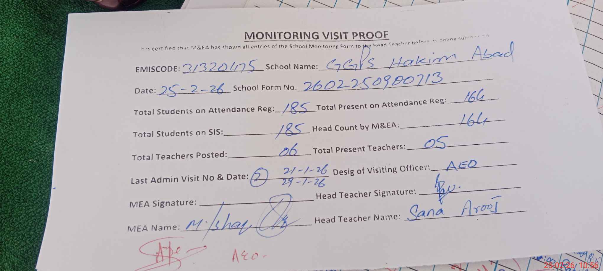 | Attendance Register | Head Teacher | MEA with School | Visit Proof |
