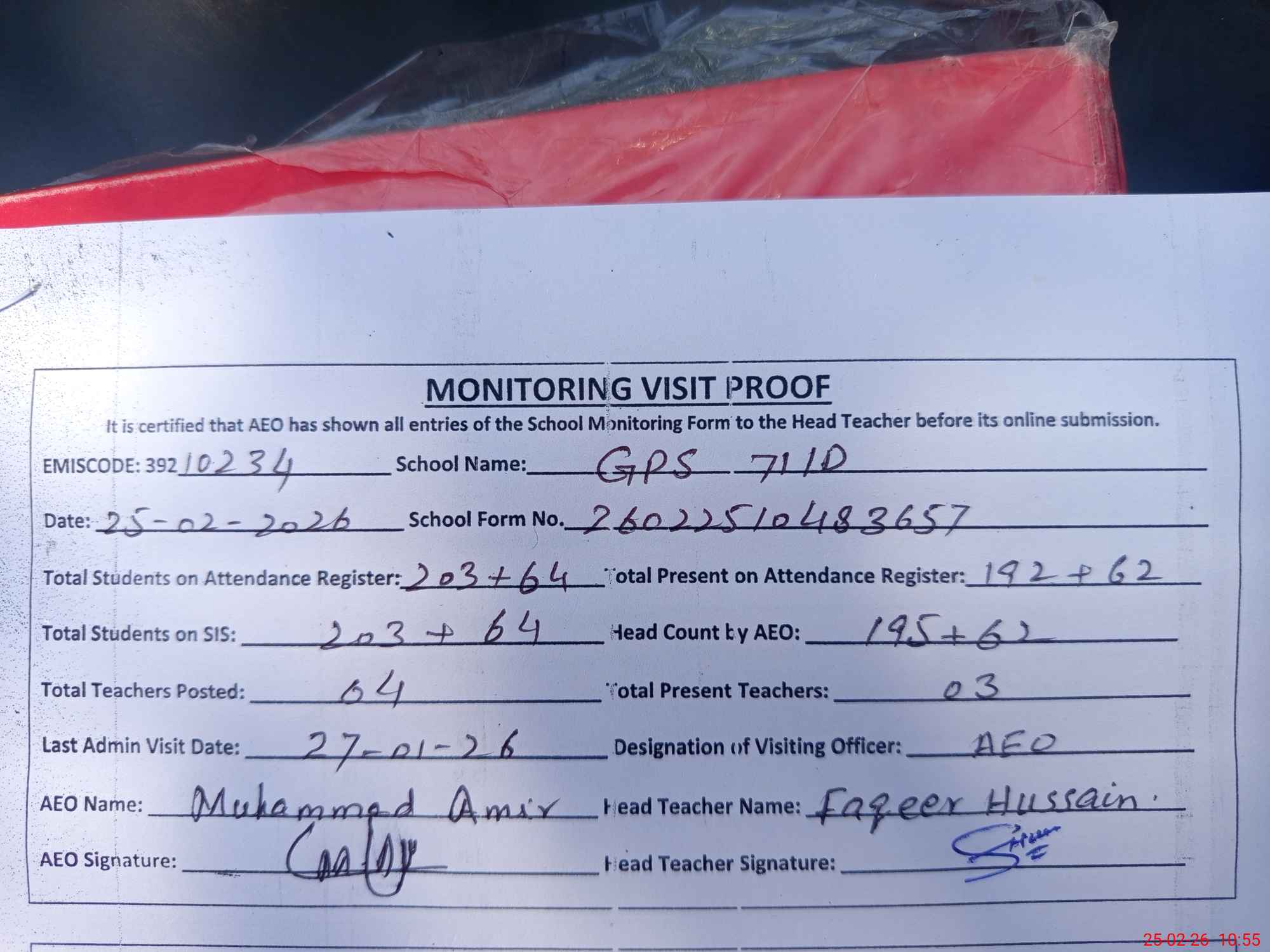| Attendance Register | Head Teacher | MEA with School | Visit Proof |