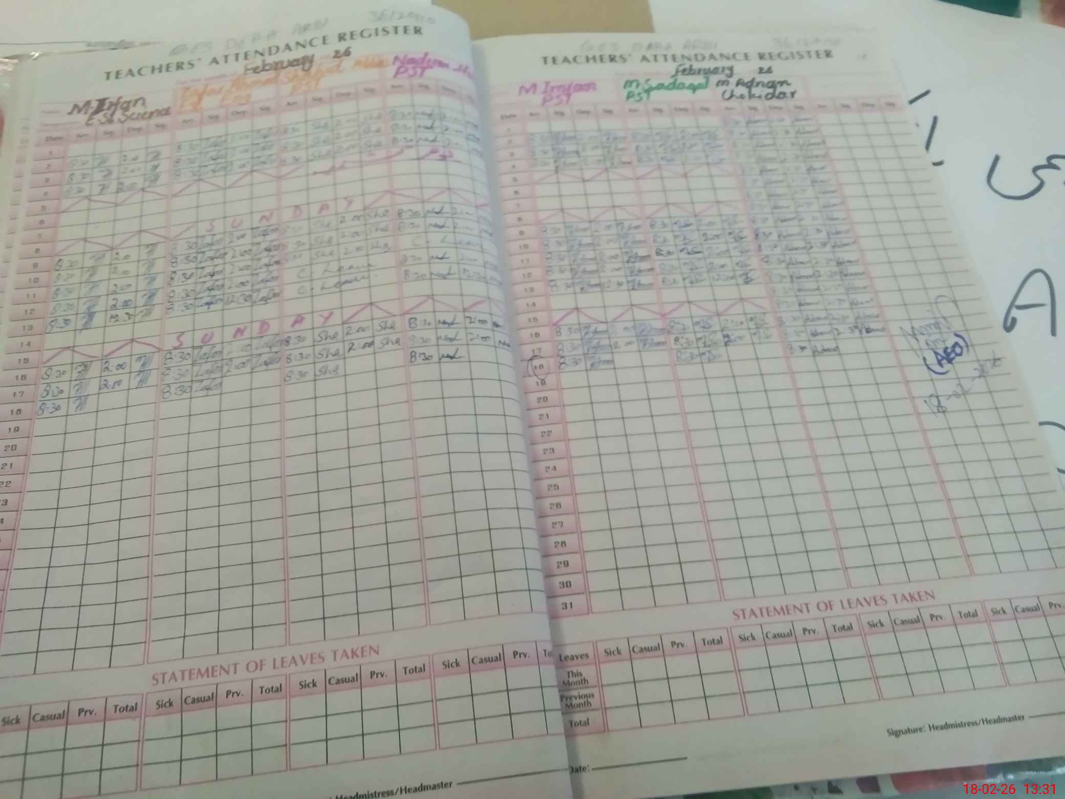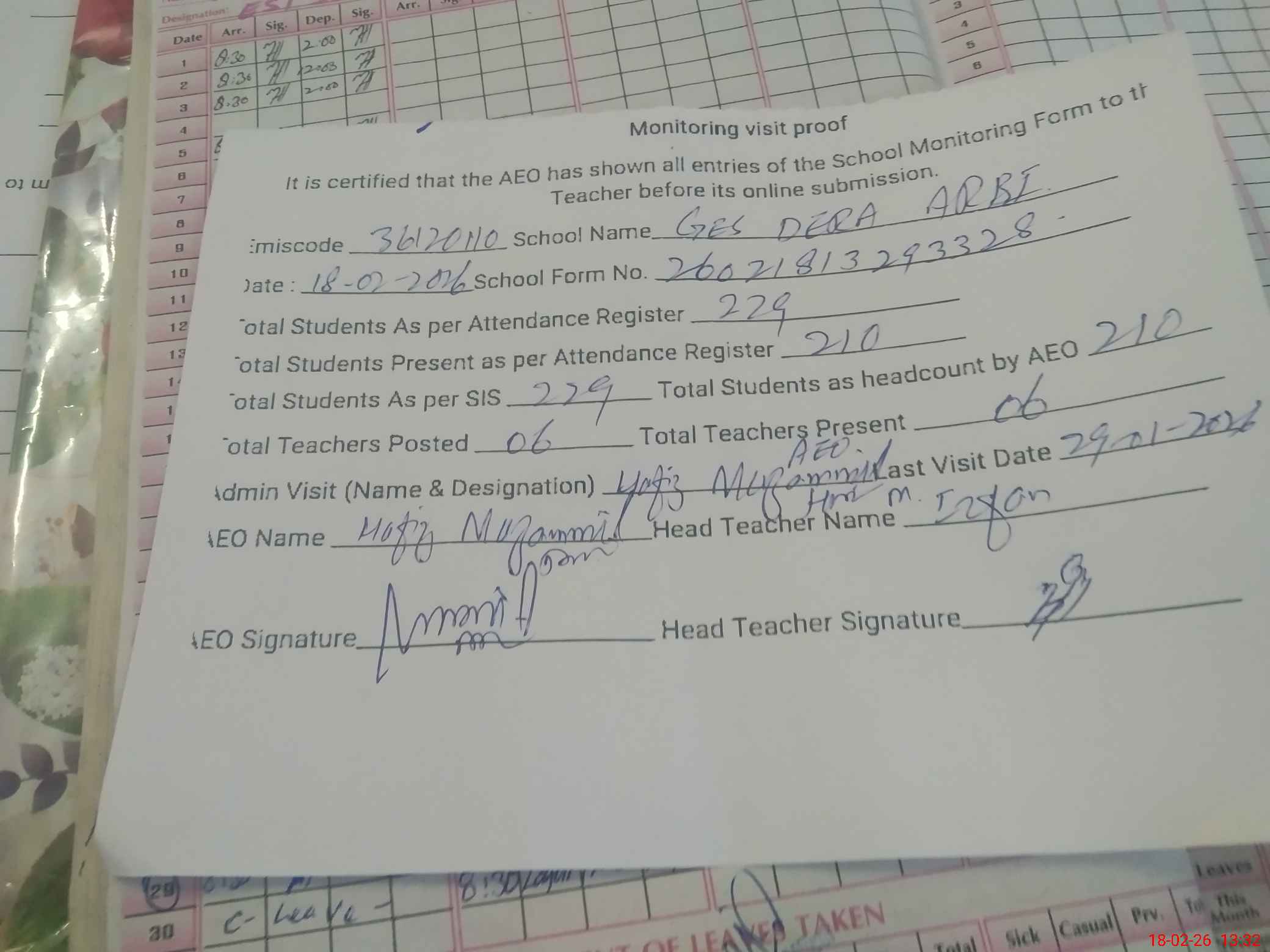 | Attendance Register | Head Teacher | MEA with School | Visit Proof |