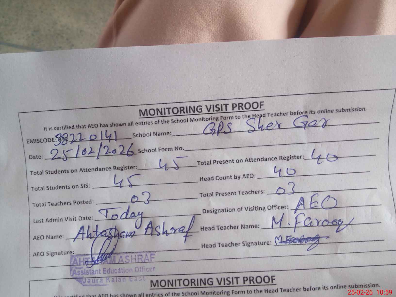 | Monitoring Date: 25-02-2026 | Start Time: 25-02-2026 10:35 AM | End Time: 25-02-2026 11:01 AM | Name of MEA: AH**** AS**** | |
