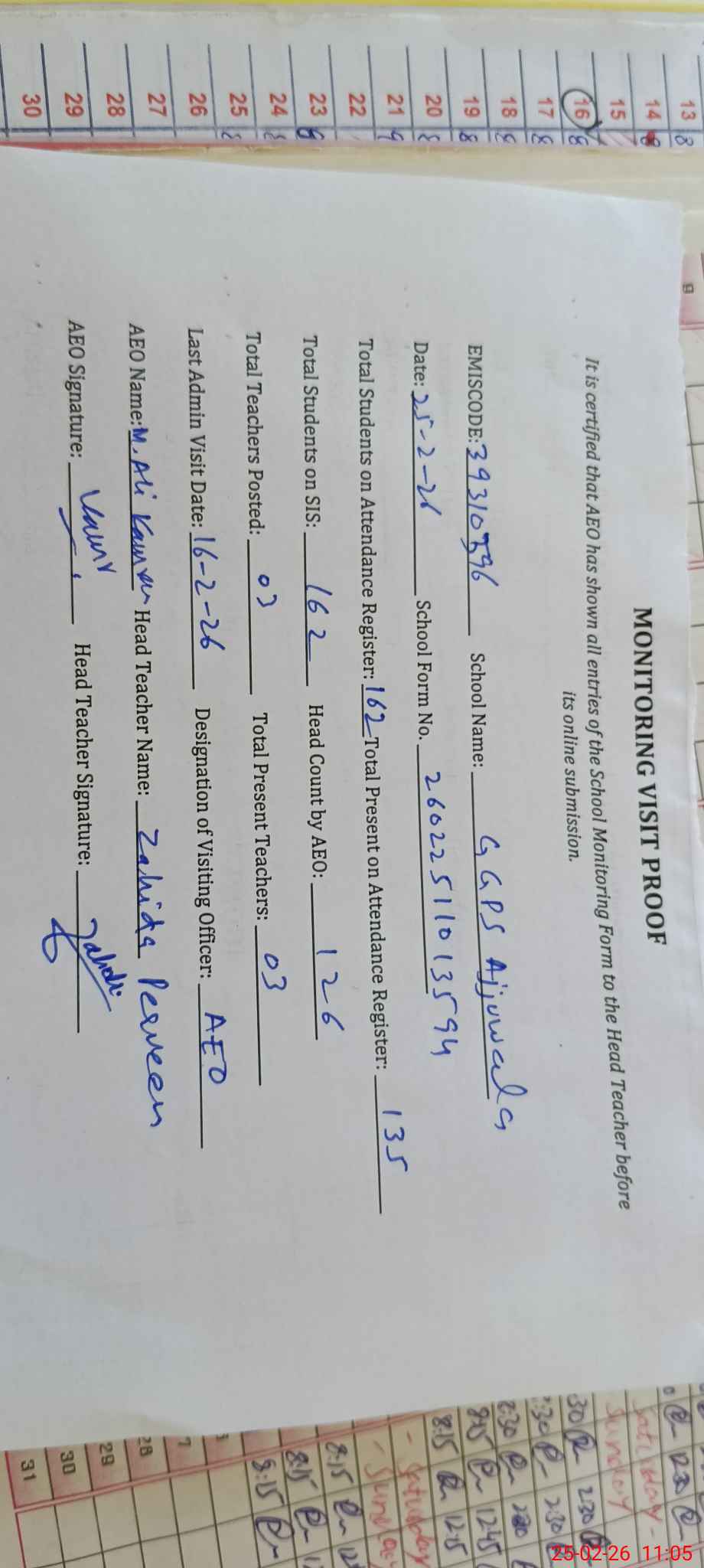 | Attendance Register | Head Teacher | MEA with School | Visit Proof |