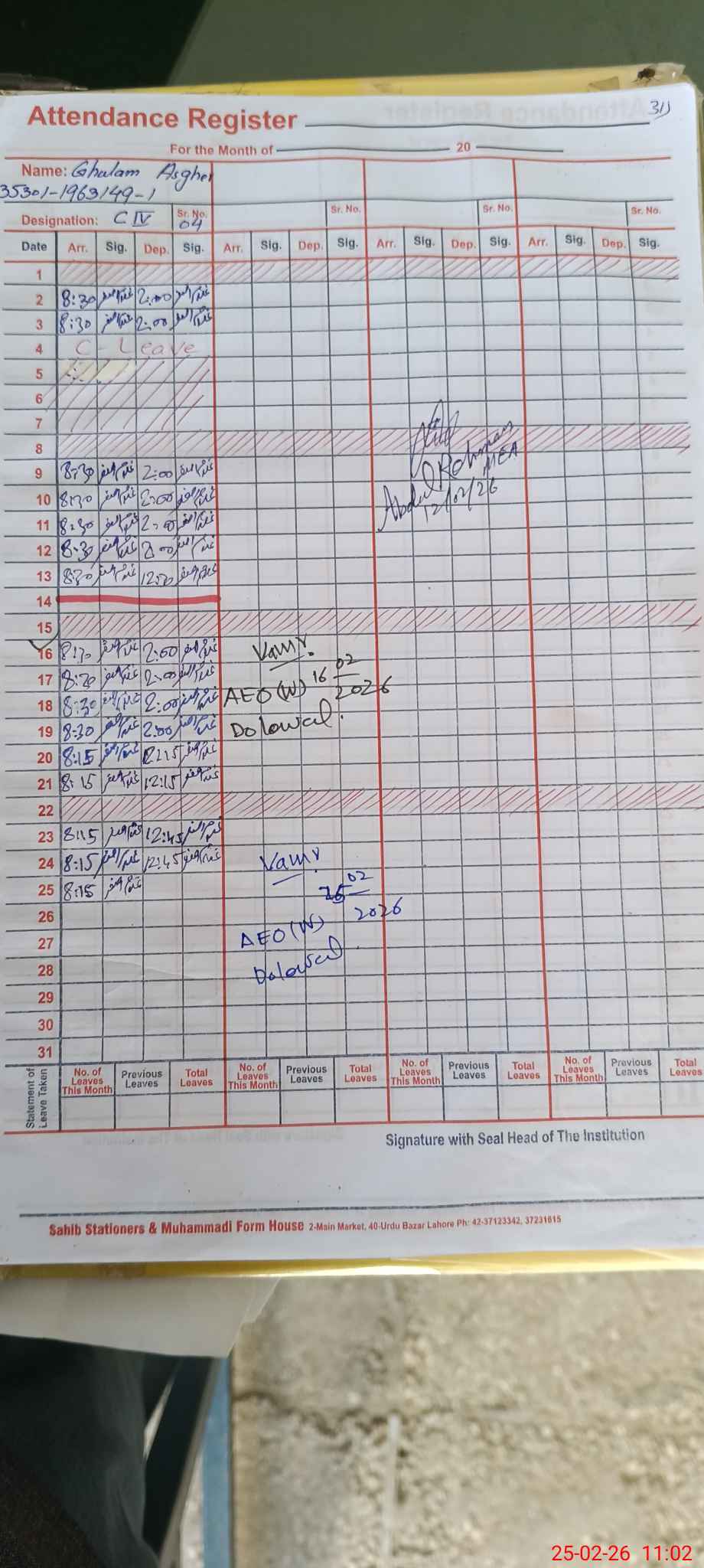 | CNIC | Full Name | Designation | R/C | Absence During Last Calender Month |