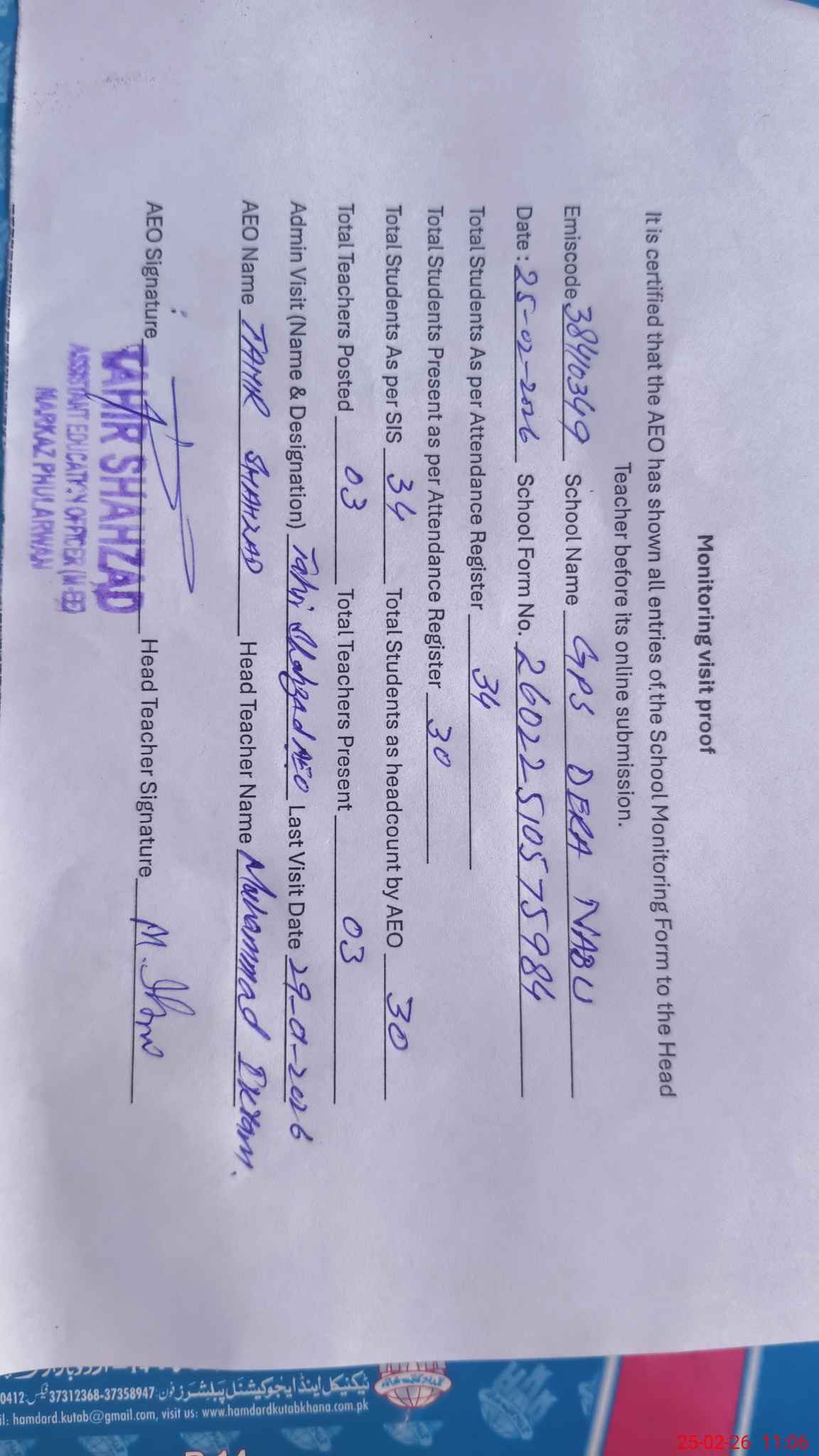 | Attendance Register | Head Teacher | MEA with School | Visit Proof |
