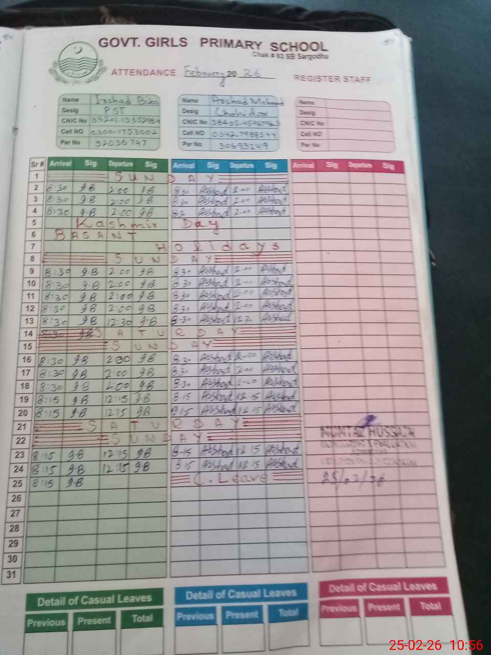 | CNIC | Full Name | Designation | R/C | Absence During Last Calender Month |