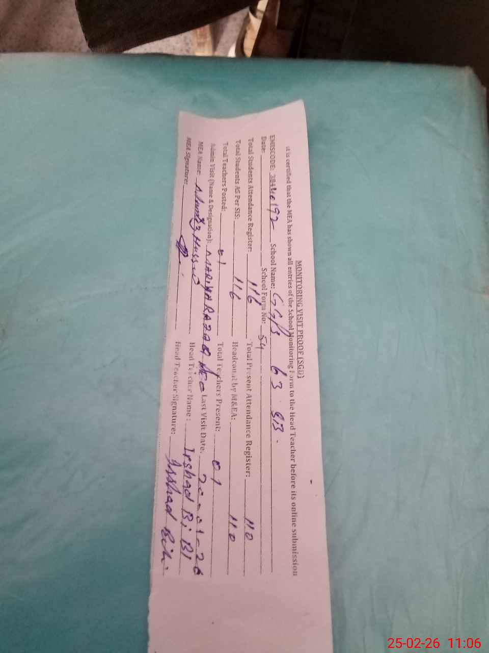 | Attendance Register | Head Teacher | MEA with School | Visit Proof |