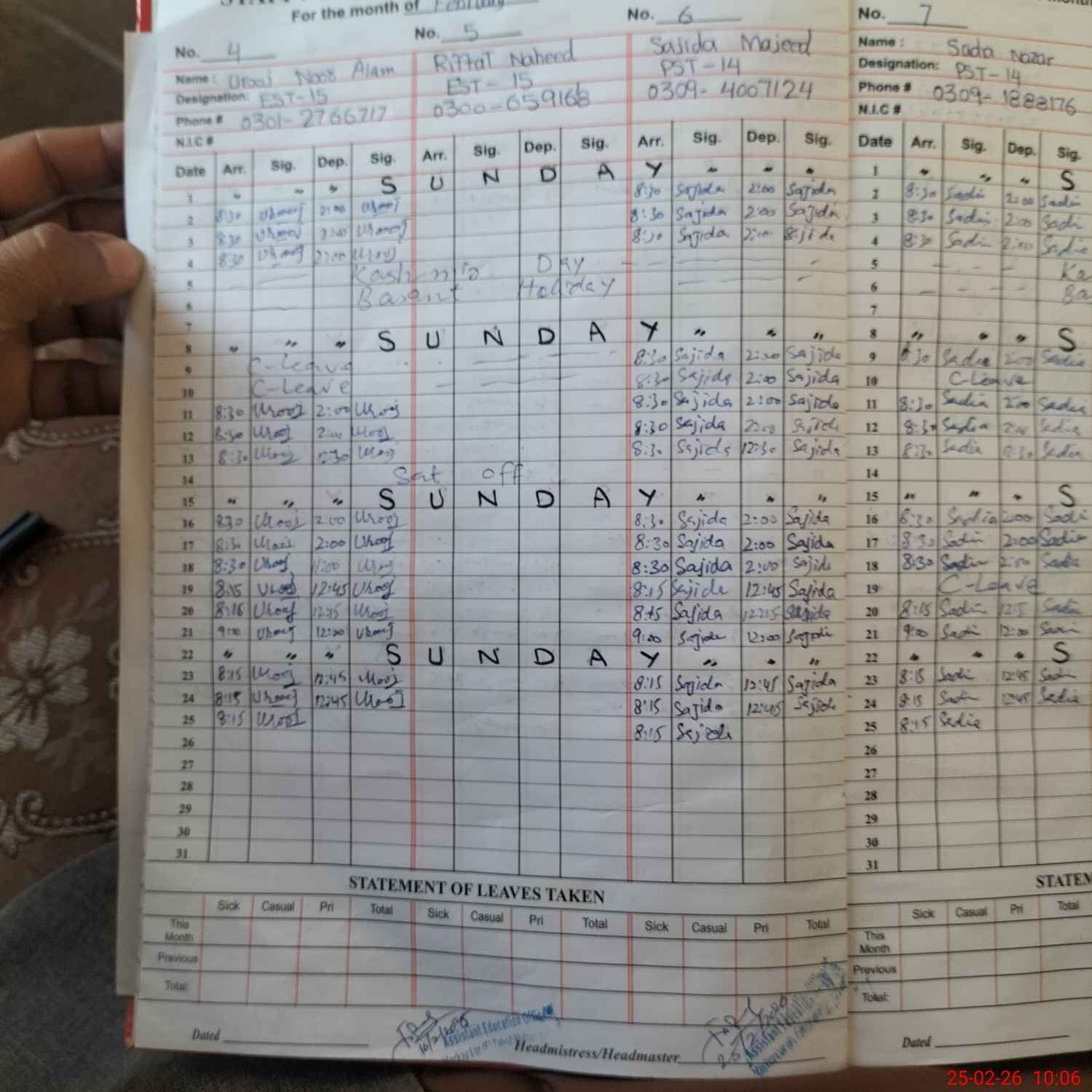 | CNIC | Full Name | Designation | R/C | Absence During Last Calender Month |