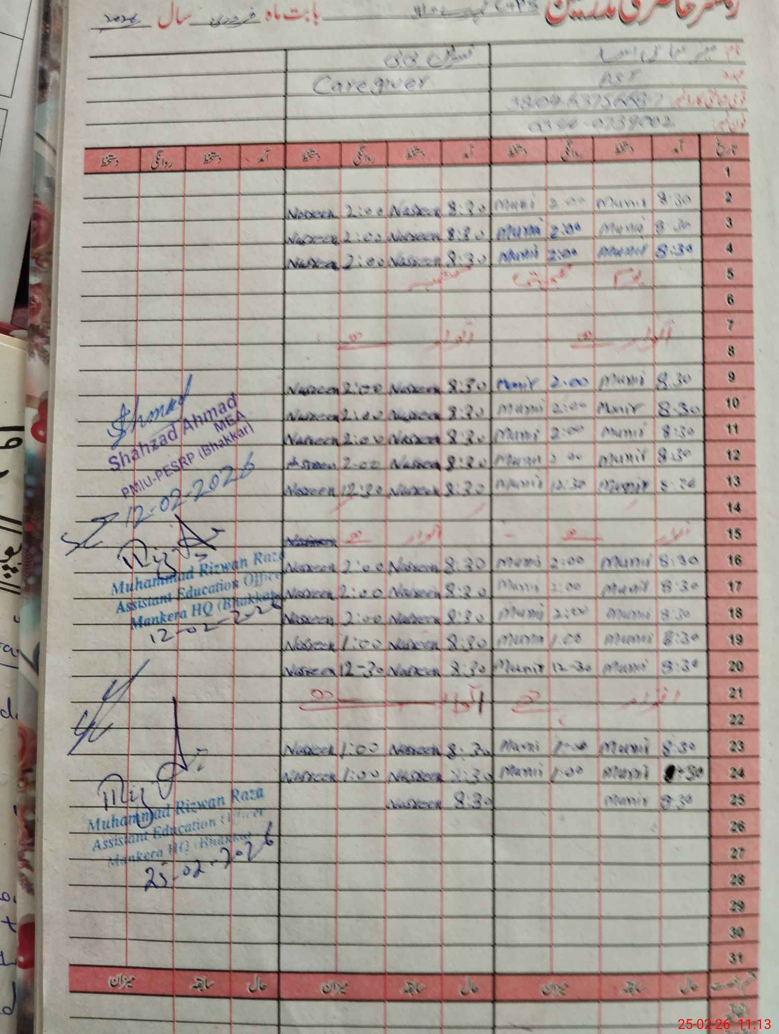 | CNIC | Full Name | Designation | R/C | Absence During Last Calender Month |