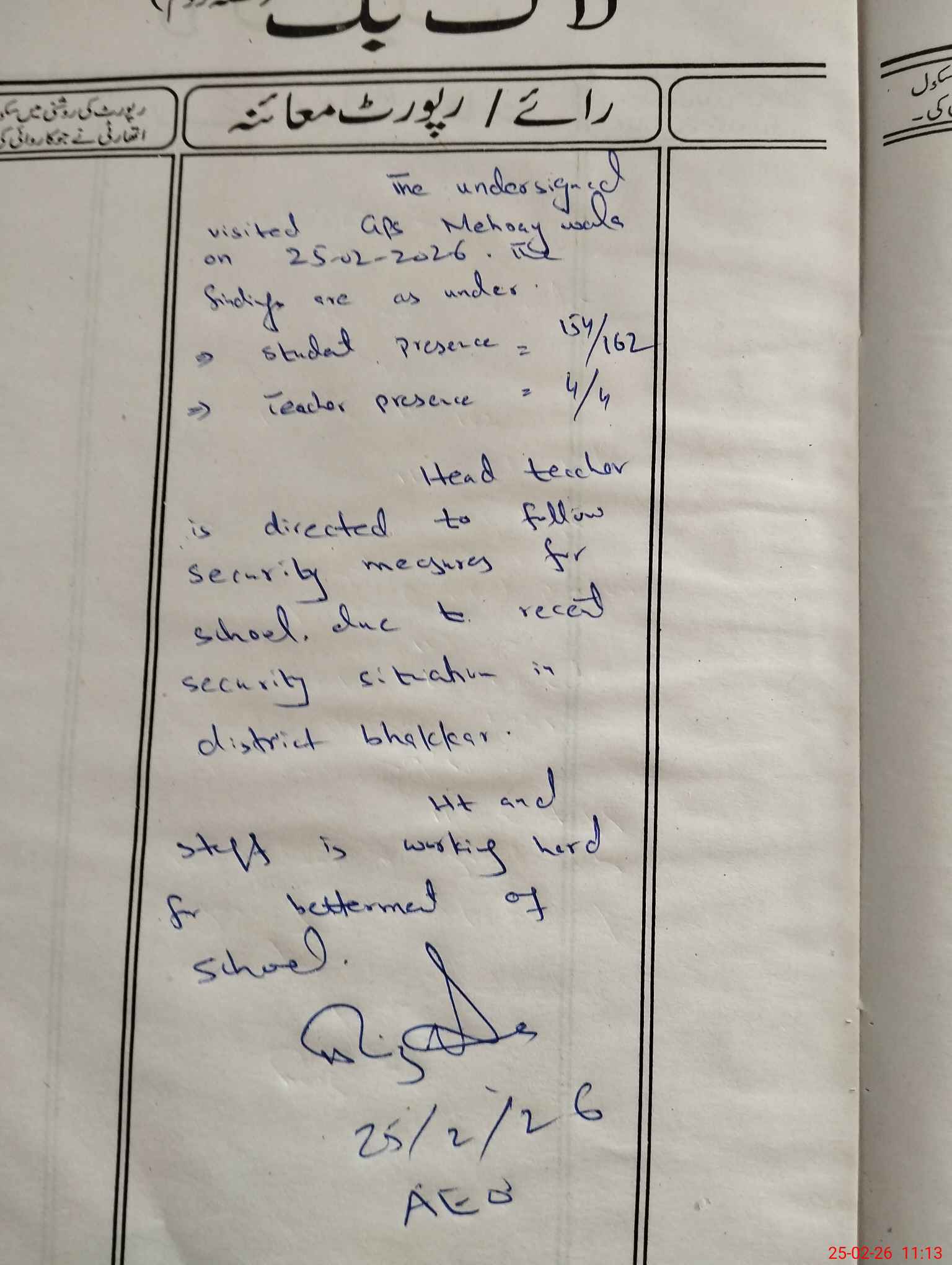 | Certified that this School was Inspected by the Undersigned MEA/DMO Today and the Information Stated Above is as Per Record. | |||||