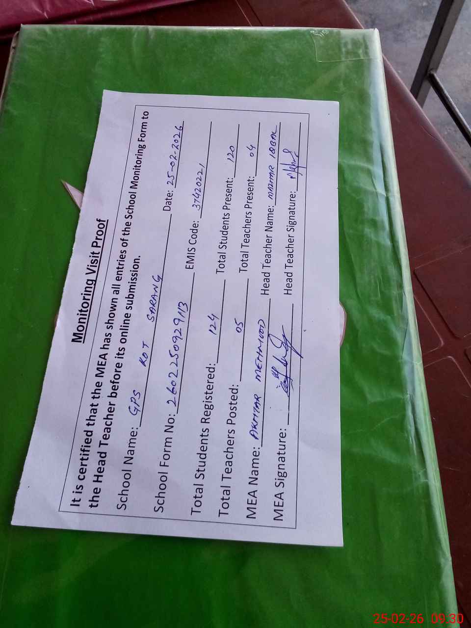 | Attendance Register | Head Teacher | MEA with School | Visit Proof |