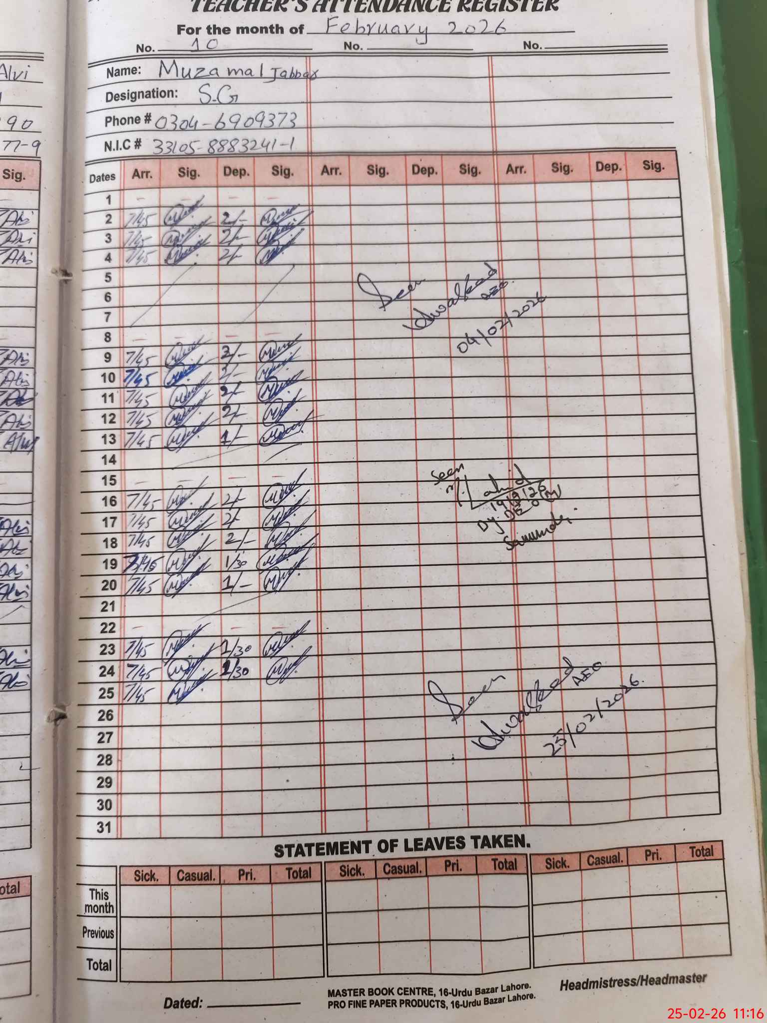 | CNIC | Full Name | Designation | R/C | Absence during last cal. month |