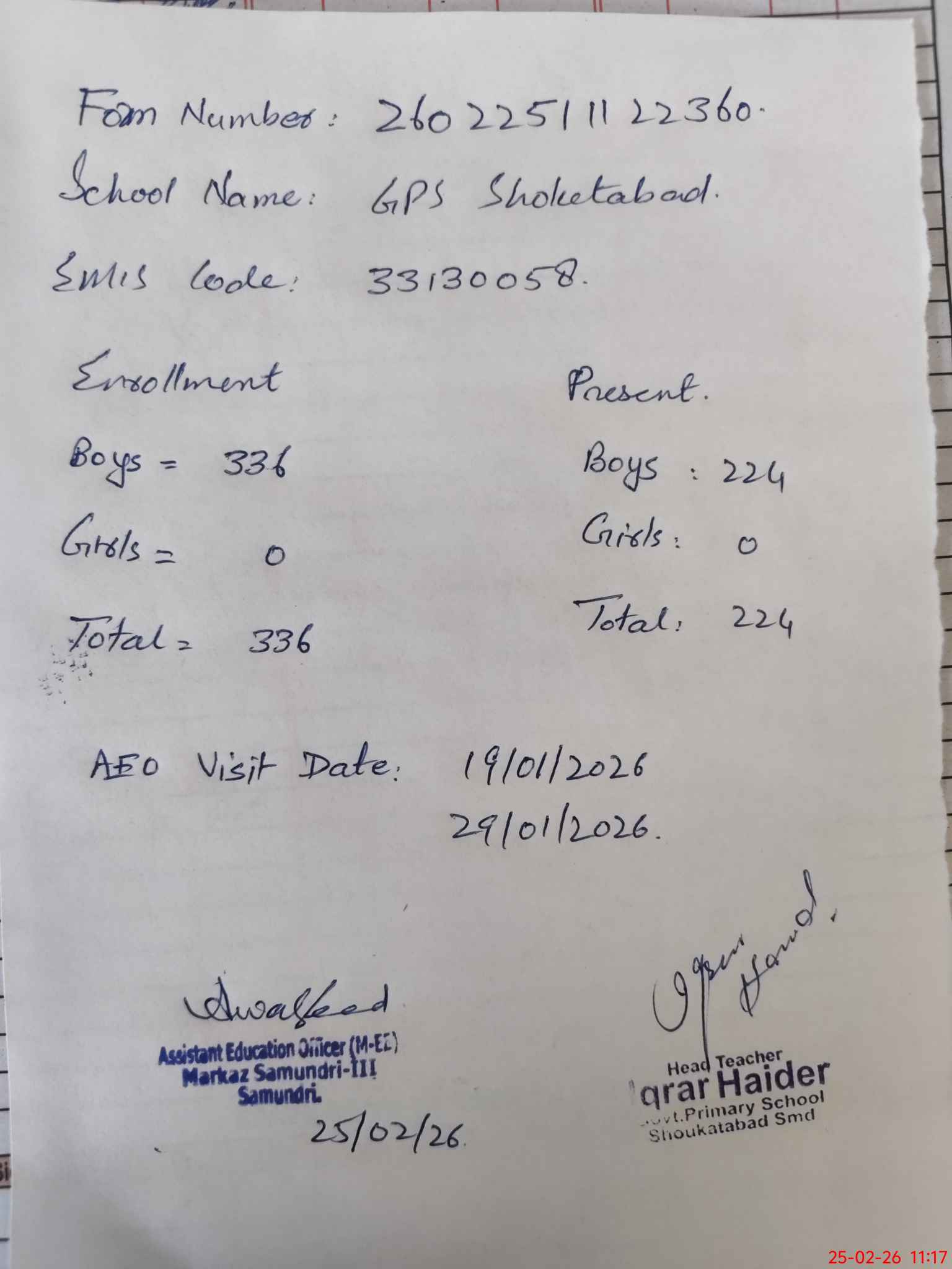 | EMIS Code: 33130058 | Name of School: GPS SHOUKAT ABAD SAMUNDRI | |||