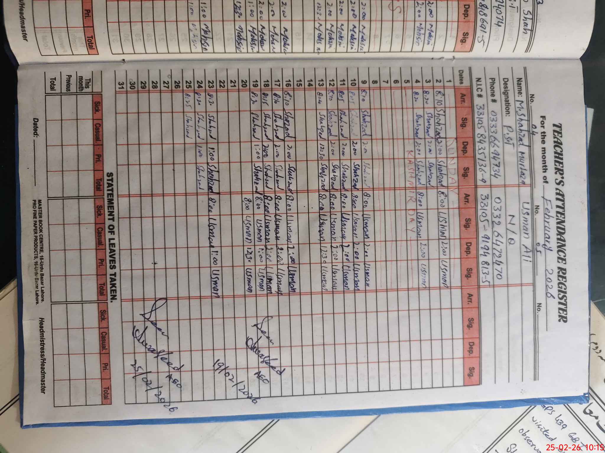 | CNIC | Full Name | Designation | R/C | Absence During Last Calender Month |