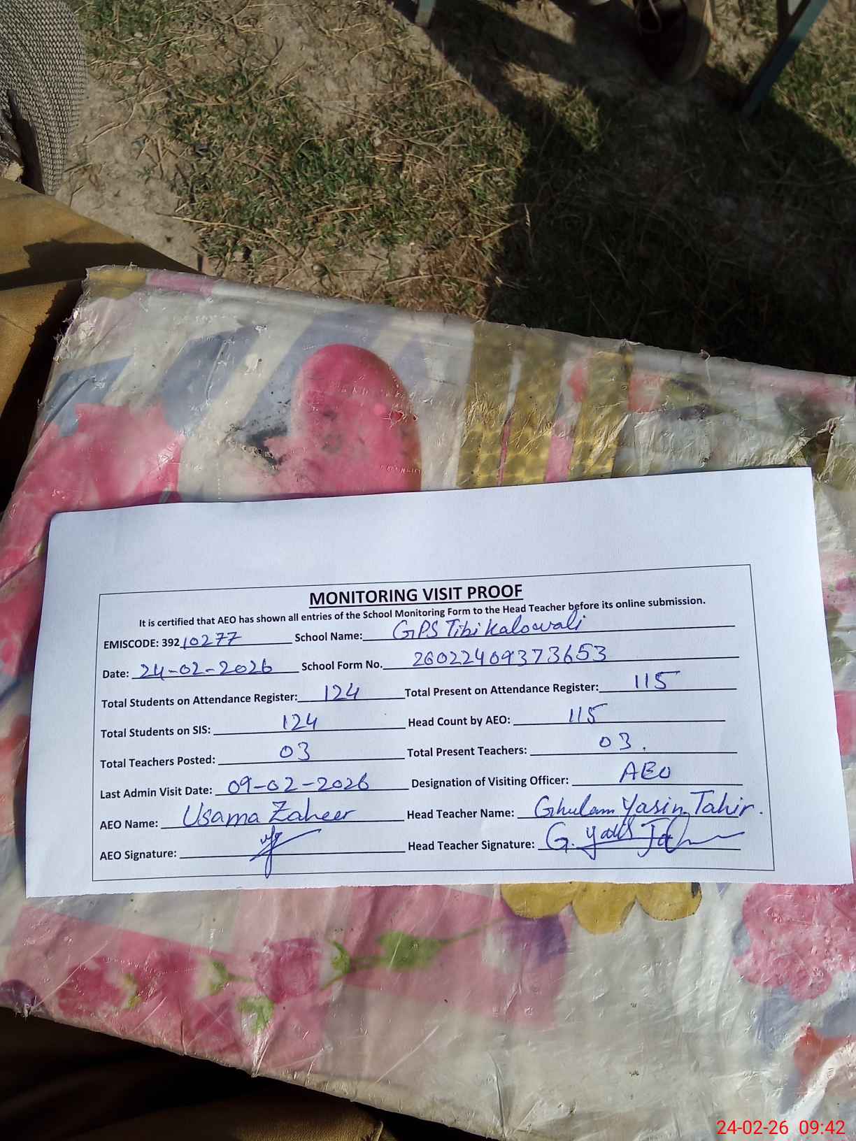 | Attendance Register | Head Teacher | MEA with School | Visit Proof |