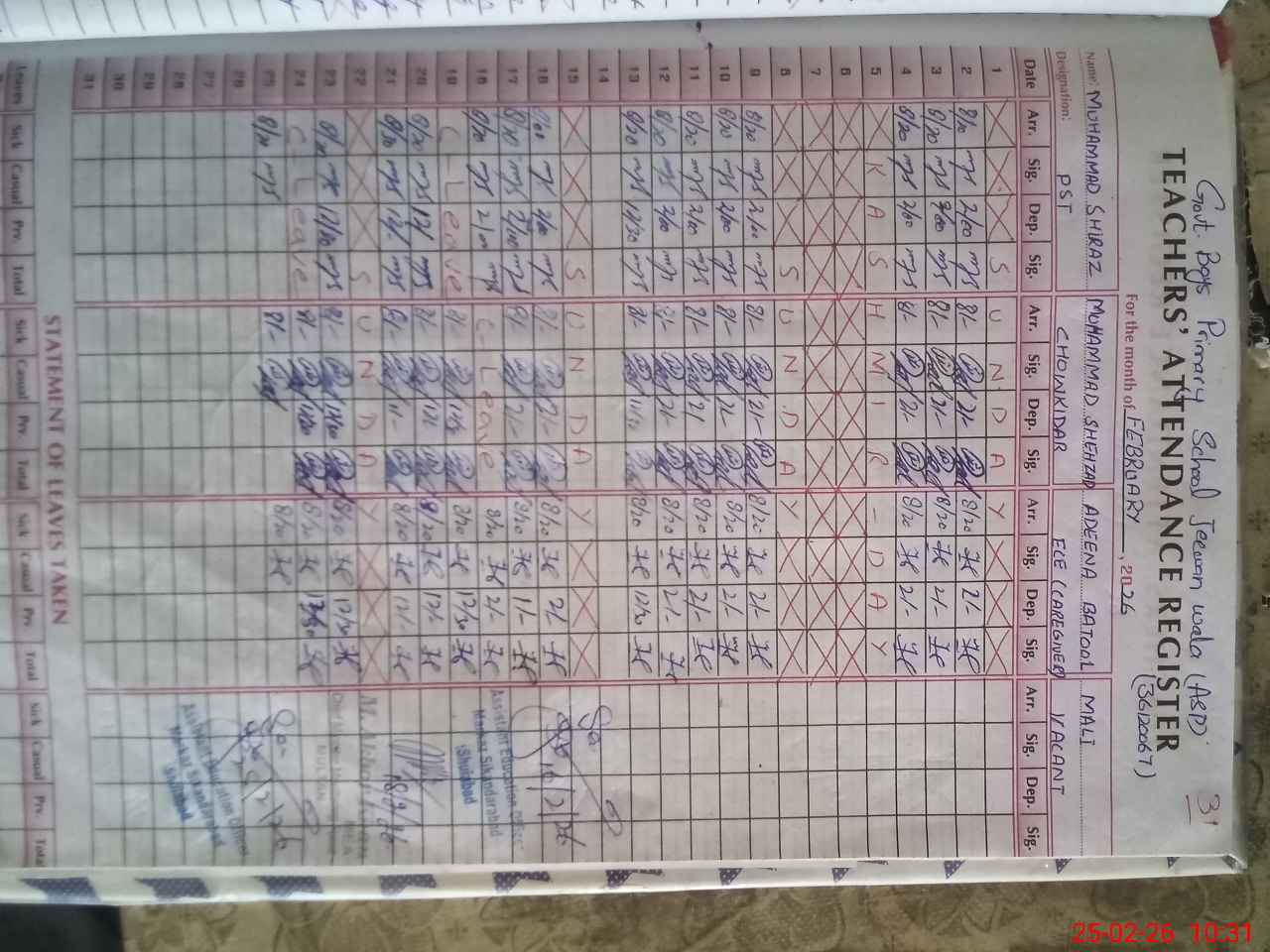 | CNIC | Full Name | Designation | R/C | Absence During Last Calender Month |