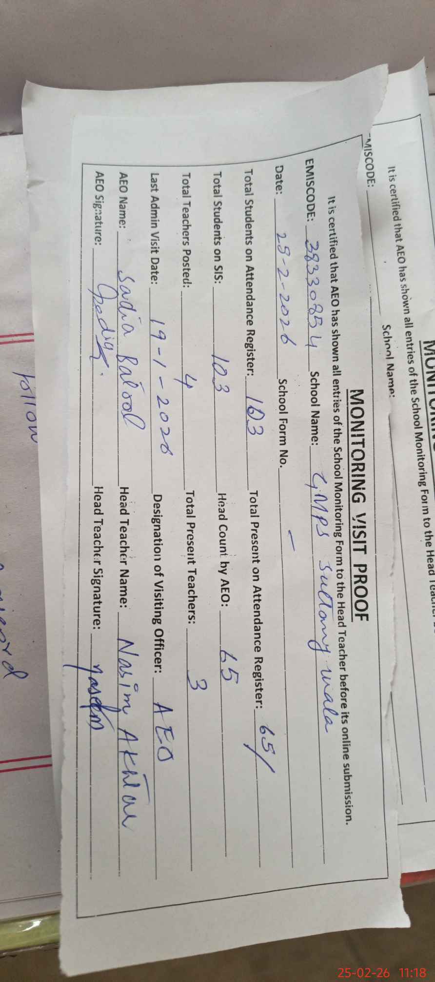 | Attendance Register | Head Teacher | MEA with School | Visit Proof |