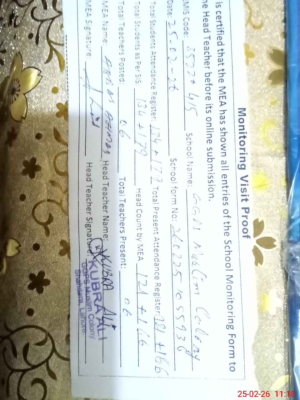 | Attendance Register | Head Teacher | MEA with School | Visit Proof |